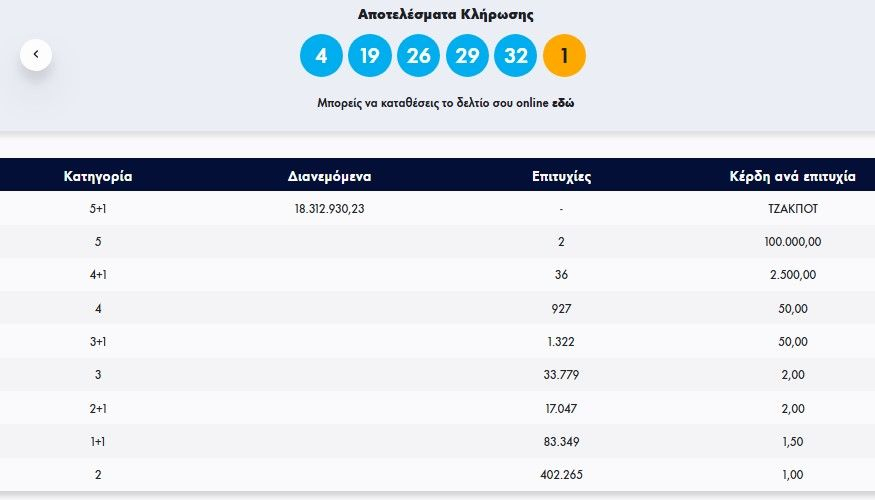 Επίσης 2 δελτία κερδίζουν από 100.000 ευρώ.