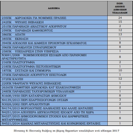 Το σύνολο των δικογραφιών που χειρίστηκε η Διεύθυνση Εσωτερικών Υποθέσεων το 2017 για τα αδικήματα που προβλέπονται στο ν.2713/1999, ανέρχεται σε 473. Από τις 473 δικογραφίες, οι 284 αφορούσαν αστυνομικό προσωπικό, οι 136 υπαλλήλους του δημόσιου τομέα, οι 40 συμμετοχή αστυνομικών και υπαλλήλων του δημοσίου και οι 13 ιδιώτες.Οι συνολικές δικογραφίες που χειρίστηκε η Διεύθυνση Εσωτερικών Υποθέσεων κατά το 2017, παρουσιάζουν μείωση, συγκριτικά με το 2016, ενώ διαφαίνεται μια αύξηση στις δικογραφίες που αφορούσαν συμμετοχή αστυνομικών και υπαλλήλων του δημοσίου (σε ποσοστό 18%) και μικρή μείωση στις δικογραφίες που αφορούσαν υπαλλήλους του δημοσίου τομέα (σε ποσοστό 10%). Τέλος, μείωση 27% παρουσιάζουν οι δικογραφίες που αφορούν αδικήματα αστυνομικών.