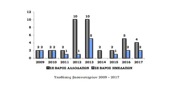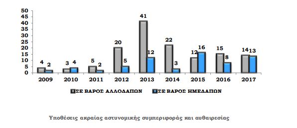Από τις 201 υποθέσεις που χειρίστηκε η Διεύθυνση Εσωτερικών Υποθέσεων από το 2009 έως το 2017, οι 65 αφορούν αδικήματα σε βάρος ημεδαπών και οι 136 σε βάρος αλλοδαπών, ενώ εξ αυτών οι 13 και 14 αντίστοιχα αφορούν το έτος 2017.