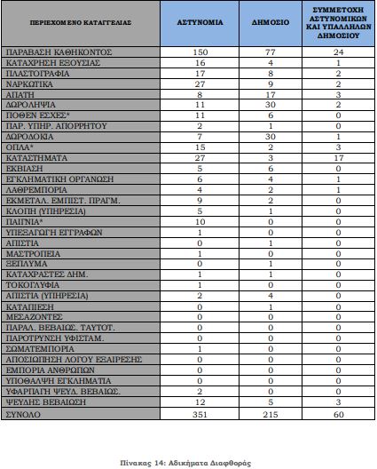 Χαρακτηριστικό είναι ότι από την τελευταία 9ετία, την διετία 2013-2014 καταγράφηκαν τα περισσότερα περιστατικά ακραίας συμπεριφοράς αστυνομικών σε βάρος πολιτών και με συντριπτικά ποσοστά σε βάρος μεταναστών και προσφύγων.Περαιτέρω, οι υποθέσεις στις οποίες ακολουθήθηκε η αυτόφωρη διαδικασία και το σύνολο των συλληφθέντων προσώπων μειώθηκε αισθητά σε σχέση με το 2016 σε ποσοστό 44%. Η τελευταία μείωση οφείλεται στον περιορισμένο αριθμό καταγγελιών που δέχθηκε η Υπηρεσία το 2017 για αδικήματα που τελέστηκαν στα χρονικά όρια του αυτοφώρου, σε σχέση με αυτές που δέχθηκε το 2016. Γενικότερα, η μείωση των στατιστικών στοιχείων (καταγγελίες, δικογραφίες, αυτόφωρα και συλλήψεις) συμπορεύεται με τη βελτίωση της θέσης που είχε η χώρα μας το 2017 στην παγκόσμια κατάταξή της, σε ότι αφορά στο «Δείκτη Αντίληψης Διαφθοράς». Σύμφωνα λοιπόν με την ετήσια έκθεση απολογισμού του Εσωτερικών Υποθέσεων για το περασμένο έτος, από την «χαρτογράφηση» των καταγγελιών/πληροφοριών ανά Περιφέρεια της χώρας παρατηρείται πως οι μισές καταγγελίες (54,2%) που υποβάλλονται στην Υπηρεσία αφορούν την Αττική, ενώ η κατανομή τους στην υπόλοιπη χώρα είναι σχετικά ομοιόμορφη, με ελαφρά συγκέντρωση στις περιοχές της Κεντρικής Μακεδονίας (12,5%), της Κρήτης (4,4%) και της Ανατολικής Μακεδονίας και Θράκης (4,3%).Αυτό εξηγείται λόγω και της αντίστοιχης κατανομής του πληθυσμού, ο οποίος έχει συγκεντρωθεί στα αστικά κέντρα (Αττική, Θεσσαλονίκη, Ηράκλειο), αλλά και από το γεγονός ότι οι περισσότερες Κεντρικές Δημόσιες Υπηρεσίες και Υπουργεία βρίσκονται στην Αττική. Ο αυξημένος αριθμός των καταγγελιών στην Περιφέρεια Ανατολικής Μακεδονίας και Θράκης οφείλεται ιδίως σε περιστατικά αστυνομικής αυθαιρεσίας σε βάρος αλλοδαπών.