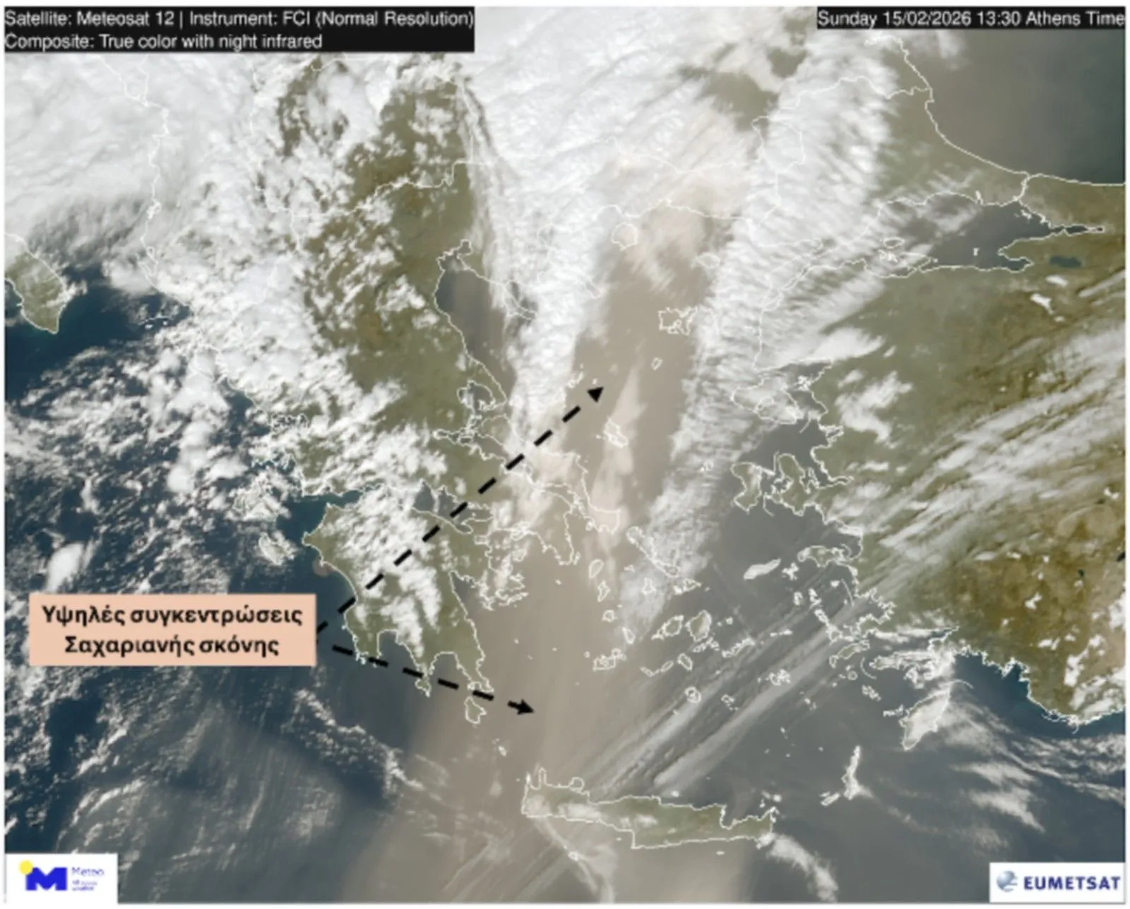 Υψηλές συγκεντρώσεις σαχαριανής σκόνης καταγράφονται σε μεγάλο μέρος της χώρας σήμερα το μεσημέρι, Κυριακή 15 Φεβρουαρίου. Σύμφωνα με τον σταθμό ποιότητας αέρα του Εθνικού Αστεροσκοπείου Αθηνών/meteo.gr, στο Ρέθυμνο οι συγκεντρώσεις PM10 ξεπερνούσαν τα 460 μg/m³ στις 13:30.