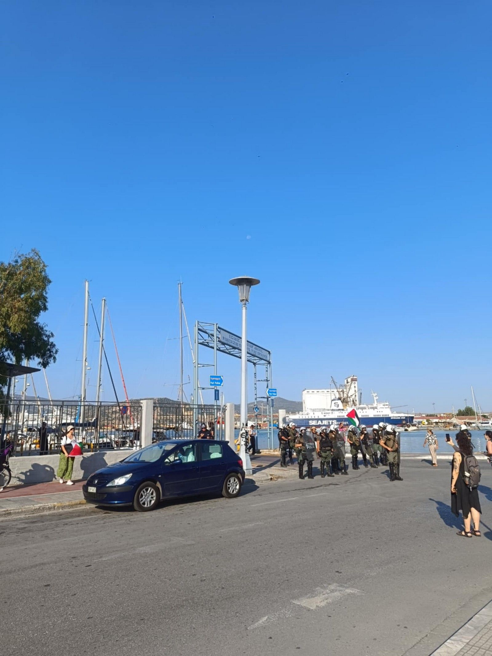 Κατά τη διάρκεια της διαμαρτυρίας, δύο διμοιρίες ΜΑΤ τοποθετήθηκαν μπροστά από τους πολίτες, προκειμένου να εμποδίσουν την ανάρτηση πανό με συνθήματα ορατά από το πλοίο στην οδό Αθηνών.