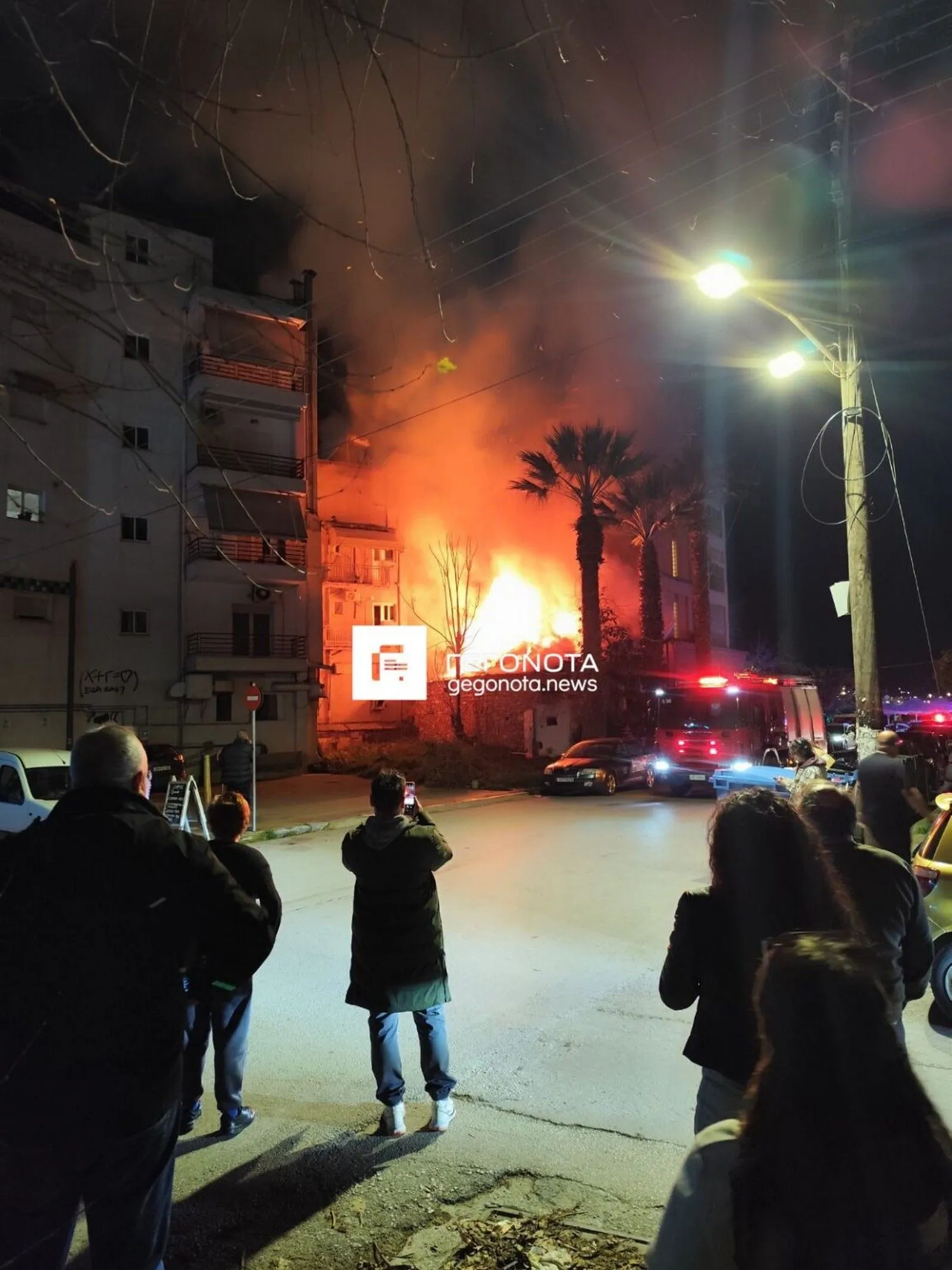 Σύμφωνα με την Πυροσβεστική, η φωτιά εκδηλώθηκε σε εγκαταλειμμένο κτίριο και δεν υπάρχει κίνδυνος εξάπλωσής της σε παρακείμενα κτίρια.
