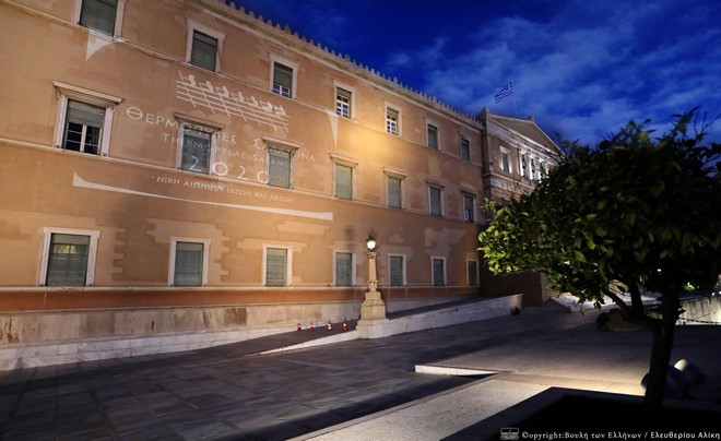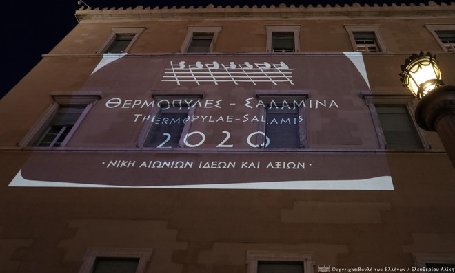 Με το λογότυπο του Επετειακού Έτους «Θερμοπύλες – Σαλαμίνα 2020» φωταγωγήθηκε το βράδυ της Τρίτης η Βουλή των Ελλήνων