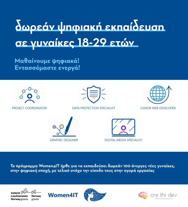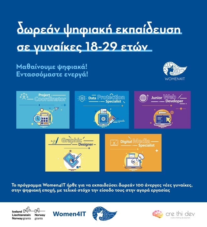 Το «Women4IT» έρχεται να δώσει ψηφιακή τεχνογνωσία και τεχνολογικές δεξιότητες σε 100 νέες γυναίκες, ηλικίας 18-29 ετών, σε 70 από τις οποίες θα εξασφαλίσει και το εισιτήριο στην αγορά εργασίας. Η εκπαίδευση είναι δωρεάν για όλες, στα ελληνικά και εξειδικεύεται στους τομείς: Διαχείριση έργων (project coordinator), Ασφάλεια δεδομένων (data protection specialist), Κατασκευή ιστοσελίδων (web developer), Γραφιστική (graphic designer), Διαχείριση μέσων κοινωνικής δικτύωσης (digital media specialist).