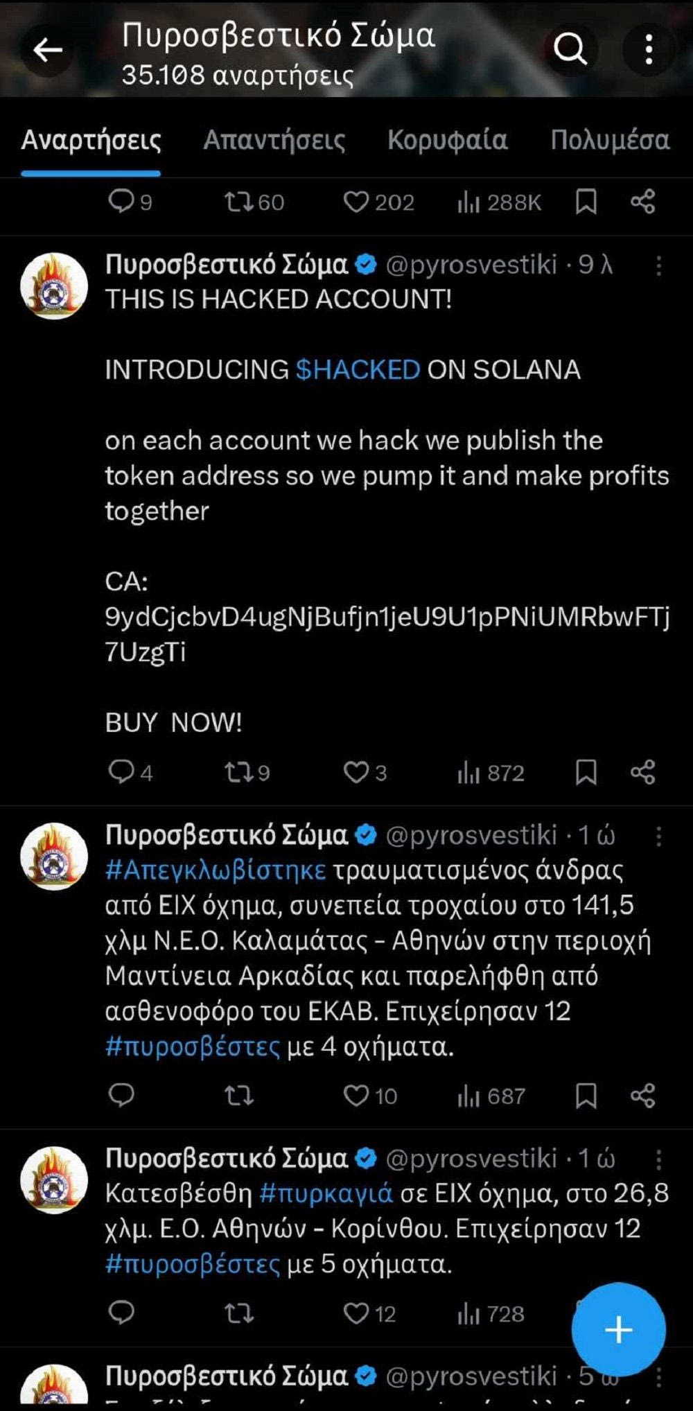 Λίγο αργότερα, η εν λόγω ανάρτηση εξαφανίστηκε από τον λογαριασμό, με την Πυροσβεστική να κάνει ανάρτηση στην οποία γνωστοποιεί κι επίσημα ότι ο λογαριασμός της στο X είναι χακαρισμένος.