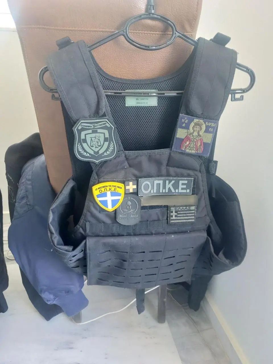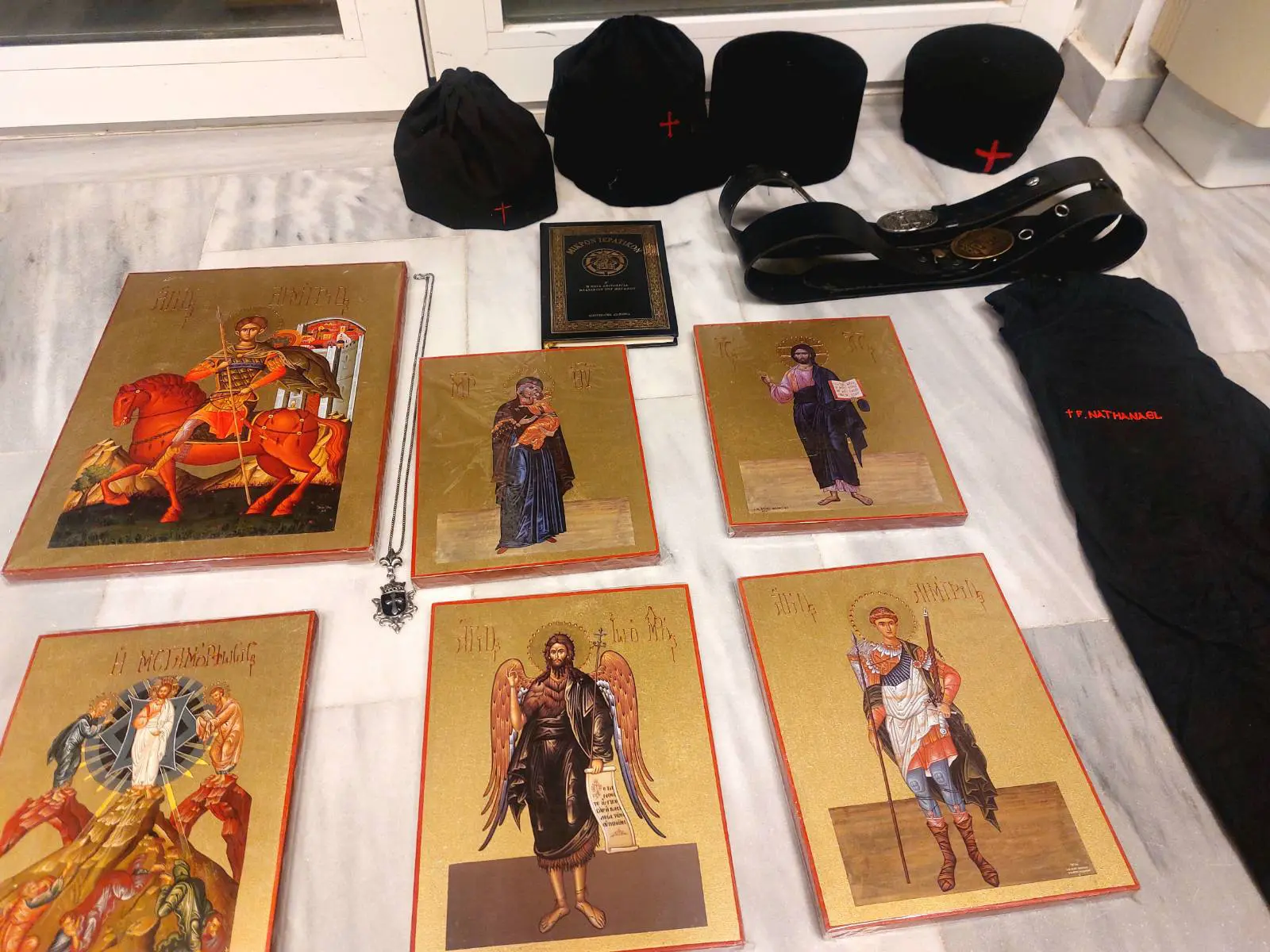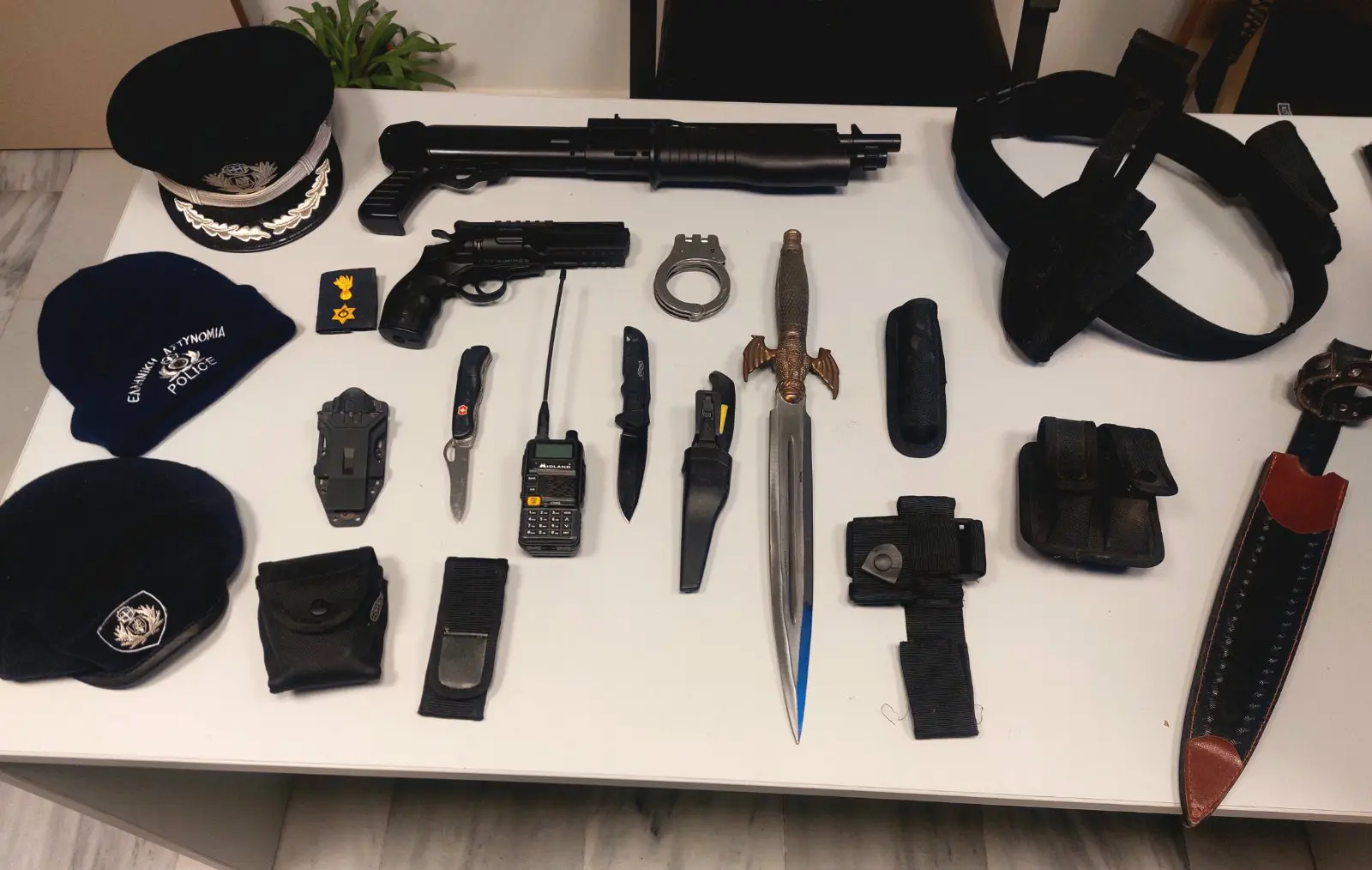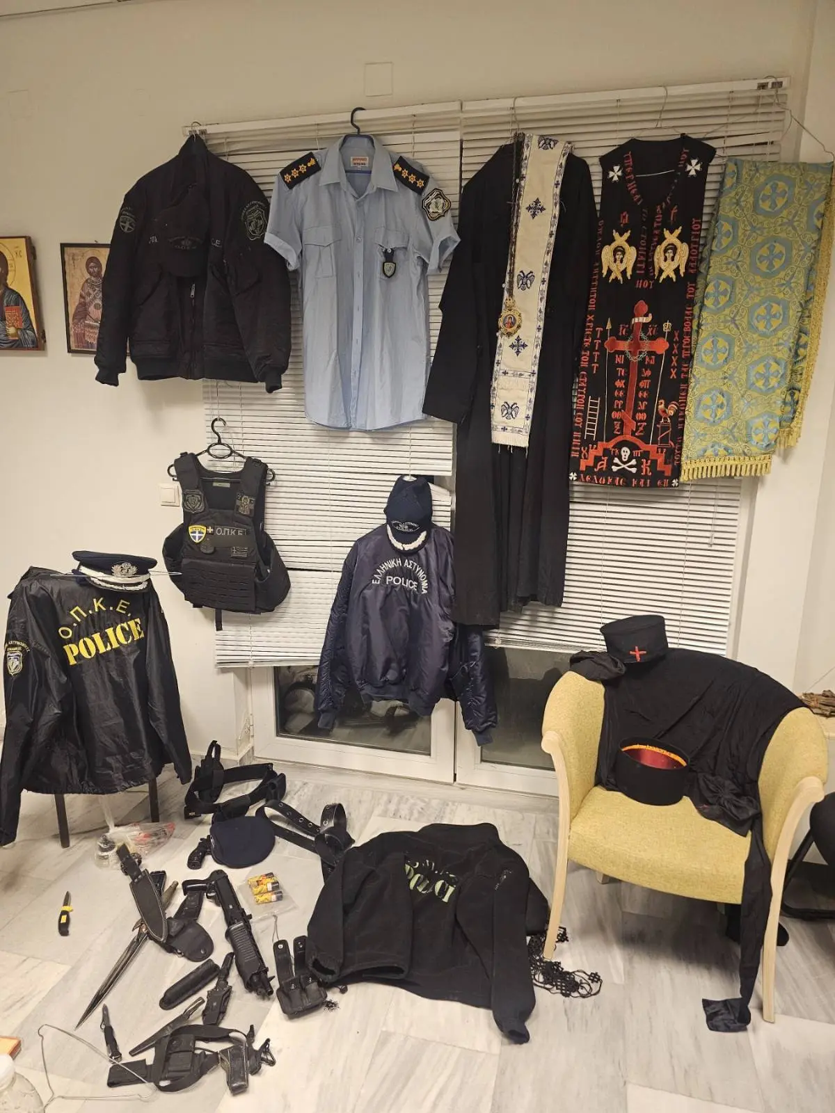 Κατά τη διάρκεια της έρευνας βρέθηκαν και κατασχέθηκαν είδη ένδυσης ιερέα (ράσο, ιερατικά καλπάκια-καπέλα, πετραχήλι, δερμάτινες ζώνες μοναχού με εκκλησιαστικά σύμβολα κ.α), εκκλησιαστικά είδη (σάβανο, επίχρυσο δεσποτικό εγκόλπιο), έξι εκκλησιαστικές εικόνες, ένα εκκλησιαστικό βιβλίο, 4 μπουφάν με διακριτικά της ΕΛ.ΑΣ., χειροπέδες, μία θήκη γεμιστήρων πιστολιού, μία θήκη πτυσσόμενου κλομπ, μία επιχειρησιακή ζώνη (εξάρτηση) με προσαρμοσμένα σε αυτήν θήκη πιστολιού, θήκη γεμιστήρα, θήκη κλομπ και θήκη χειροπέδων, ένας λειτουργικός ασύρματος), ένα θερινό πουκάμισο αστυνομικής στολής με διακριτικά σήματα της ΕΛ.ΑΣ., ένα επιχειρησιακό γιλέκο, με διακριτικά σήματα της ΕΛ.ΑΣ., ένα αστυνομικό πηλήκιο και δύο αστυνομικά τζόκει, με διακριτικά της ΕΛ.ΑΣ., δύο αεροβόλα όπλα, 6 πακέτα με μεταλλικά σφαιρίδια, ένα ξίφος και 3 μαχαίρια. Η προανάκριση διενεργείται από το Αστυνομικό Τμήμα Κισσάμου.