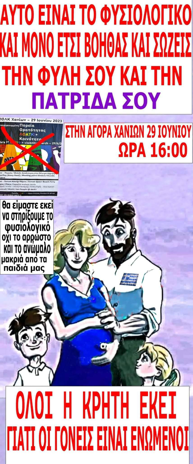 Ήδη από προχθές, αφίσες για την πορεία “αντιpride” στην Κρήτη έχουν κατακλύσει το διαδίκτυο, με τα ποστ να καλούν τους πολίτες να στηρίξουν “το φυσιολογικό” και όχι “το άρρωστο και το ανώμαλο“, ενώ οι διοργανωτές σε… άπταιστα ελληνικά γράφουν με κεφαλαία: «Όλοι η Κρήτη εκεί, γιατί οι γονείς είναι ενωμένοι».