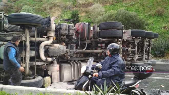 Ο 60χρονος οδηγός του φορτηγού μεταφέρθηκε με το ασθενοφόρο στο Βενιζέλειο νοσοκομείο Ηρακλείου όπου και νοσηλεύεται εκτός κινδύνου.
