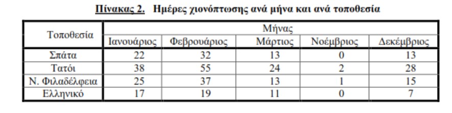 Οι περισσότερες ημέρες χιονιού στην Αττική παρατηρούνται στο Τατόι και οι λιγότερες στο Ελληνικό. Αυτό εξηγείται πολύ απλά διότι «οι ημέρες χιονόπτωσης σε έναν σταθμό αυξάνουν όσο μακρύτερα βρίσκεται ο σταθμός αυτός από τη θάλασσα και όσο το υψόμετρό του αυξάνει». Οι περισσότερες ημέρες χιονόπτωσης παρατηρούνται τον Φεβρουάριο, ενώ ακολουθεί σε ημέρες χιονιού ο Ιανουάριος. Σχεδόν ίσος αριθμός ημερών χιονόπτωσης παρατηρείται το Δεκέμβριο και το Μάρτιο, ενώ στους πιο ηπειρωτικούς σταθμούς (Τατόι και Νέα Φιλαδέλφεια) χιονόπτωση – αν και σπάνια – έχει παρατηρηθεί και το Νοέμβριο.