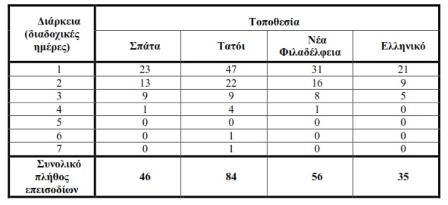 Όπως φαίνεται από τον παρακάτω πίνακα, τα περισσότερα επεισόδια χιονόπτωσης στους σταθμούς της Αττικής έχουν διάρκεια μιας ημέρας. Στο Ελληνικό κατά τα έτη 1980 -2009 δεν έχει υπάρξει επεισόδιο χιονόπτωσης με διάρκεια πάνω από τρεις ημέρες, ενώ αντίθετα στο Τατόι το ίδιο χρονικό διάστημα έχουν καταγραφεί ένα επεισόδιο χιονόπτωσης διάρκειας επτά (!) ημερών (από 19-2-2003 μέχρι και 25-2-2003) και άλλο ένα διάρκειας έξι ημερών (από 1-1-2002 μέχρι και 6-1-2002). Στο σταθμό των Σπάτων μόνο μία φορά έχουν καταγραφεί τέσσερεις διαδοχικές ημέρες χιονόπτωσης (από 22-2-2003 μέχρι και 25-2-2003).
