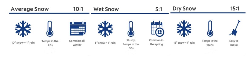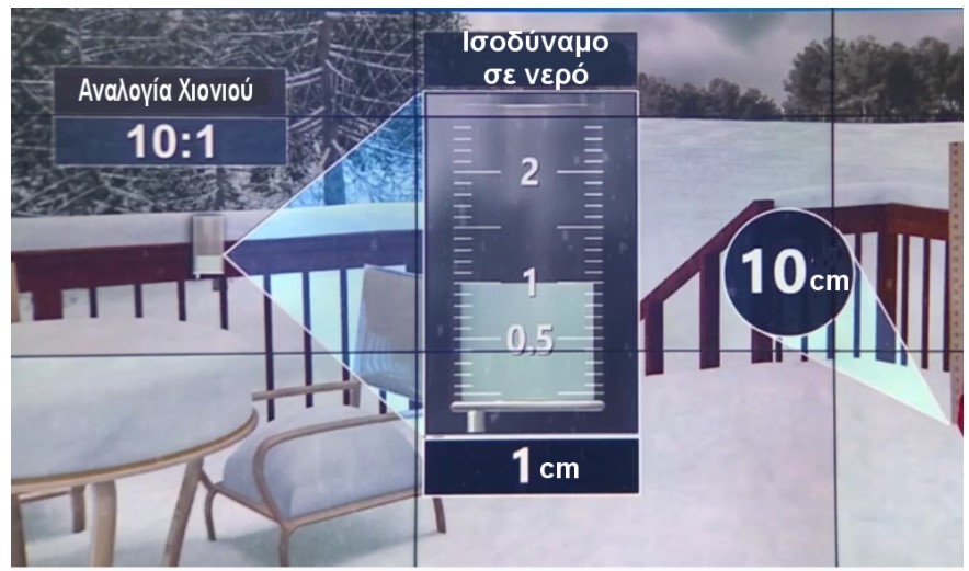 Το βάρος του χιονιού , σχετίζεται με την ποσότητα νερού που περιέχει σε κάθε νιφάδα του . Αυτό καλείται ισοδύναμο του νερού ως προς το χιόνι . Αποτελεί ένα κλάσμα που μου δείχνει την ποσότητα χιονιού πάνω από μια χιονοσκεπή επιφάνεια , αν θελήσω να λιώσω το χιόνι που βρίσκεται πάνω της και να το μετατρέψω σε νερό. Εάν επιλέξω για παράδειγμα μια στήλη χιονιού με ύψος χιονιού τα 10 cm και την μετατρέψω σε νερό και διαπιστώσω οτι αυτό καταλαμβάνει ύψος στην στήλη το 1cm – όπως στο παρακάτω σχήμα-, τότε λέω ότι έχω αναλογία 10 προς 1 . Το χιόνι προς νερό όταν παρουσιάζει αυτές τις αναλογίες (σε θερμοκρασίες περί τους -6 βαθμούς) ονομάζεται «κανονικό χιόνι» . Αν οι αναλογίες είναι 15 : 1 ή ακόμη μεγαλύτερες έχω σχηματισμό χιονιού «πούδρας» ενώ για αναλογία 5:1 έχω το «υγρό χιόνι» Δηλαδή σε αυτή την περίπτωση αρκούν 5 cm χιονιού για να μου δώσουν 1 cm χιόνι μέσα στη στήλη .