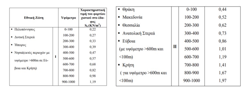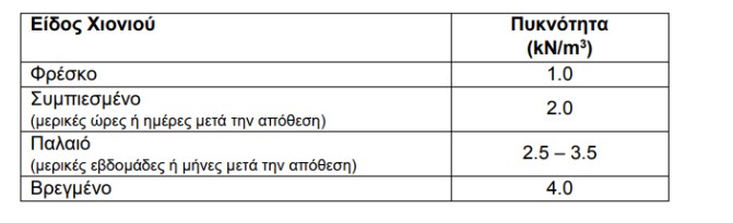 Για την πυκνότητα του χιονιού στις στέγες υπάρχουν 4 διαβαθμίσεις ανάλογα με την ποιότητα του χιονιού με ειδικούς συντελεστές ανά γεωγραφικό διαμέρισμα της χώρας μας
