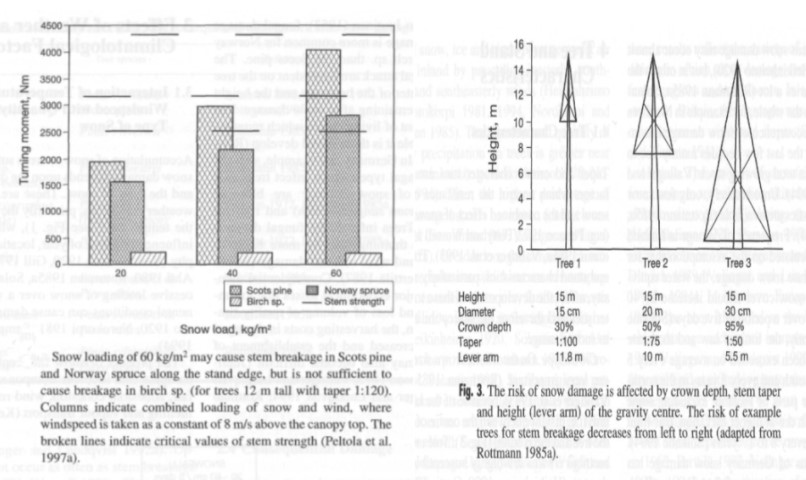 Χιονοπτώσεις μεγαλύτερης έντασης φορτίου 60 Kg/m2 δηλαδή χιονόπτωση 60 cm θεωρείται επικίνδυνη για τα δέντρα . Ο κίνδυνος ζημιάς στο χιόνι επηρεάζεται από το κωνικό στέλεχος και το ύψος του κέντρου βάρους. τους δέντρου. Ο κίνδυνος του παραπάνω παραδείγματος για θραύση κλαδιών μειώνεται από αριστερά προς δεξιά ( Rottmann 1985).
