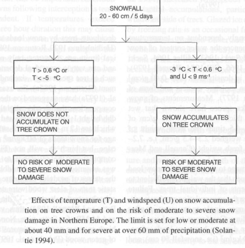 Με βάση τις μελέτες , η χιονόπτωση με φορτίο 60 Kg/m2 δηλαδή χιονόπτωση 60 cm θεωρείται επικίνδυνη με δεδομένη πνοή ανέμου εντάσεως τα 5 μποφόρ (8m/s) . Τα κωνοφόρα δέντρα βρέθηκαν ότι προσβάλλονται όταν δεχτούν φορτία χιονιού κατά προσέγγιση 50 kg / m2 (δηλ. χιονόπτωση ύψους 50 εκ), και τα φυλλοβόλα δέντρα από φορτία χιονιού 25 kg / m2 (Heikinheimo 1920, Rottmann 1985a). Αυτά είναι τα κρίσιμα όρια, ωστόσο, όλα αυτά συνδέονται και με άλλους παράγοντες όπως το είδος του δέντρου, την ηλικία ,την κατάσταση των ριζών και το μέγεθος του. Αυτές οι παράμετροι ανήκουν σε άλλους κλάδους από αυτούς της επιστήμης μου και απλώς αναφέρονται χωρίς να σχολιαστούν.