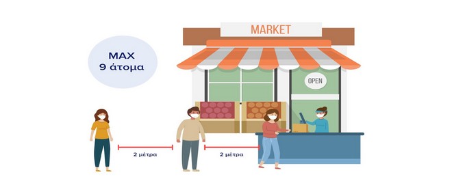- Απόσταση δύο (2) μέτρων μεταξύ πελατών και έως 9 άτομα παρόντα (ουρά).