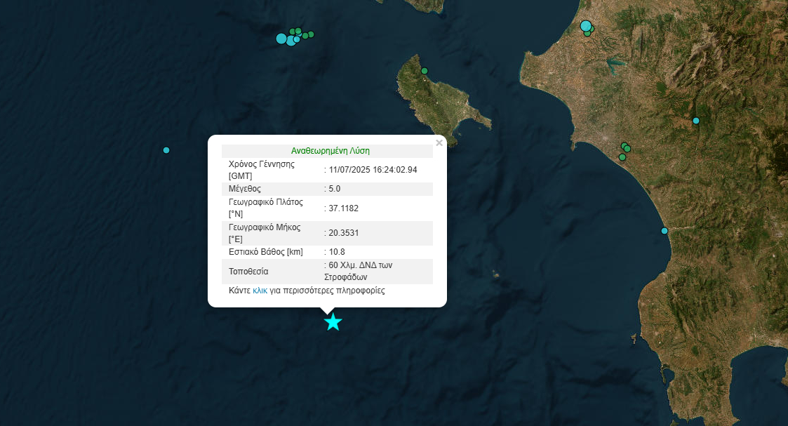 Ισχυρός σεισμός σημειώθηκε το απόγευμα της Παρασκευής (11/7) ανοιχτά της Ζακύνθου με το επίκεντρο να εντοπίζεται 60 χιλιόμετρα νοτιοδυτικά των Στροφάδων.