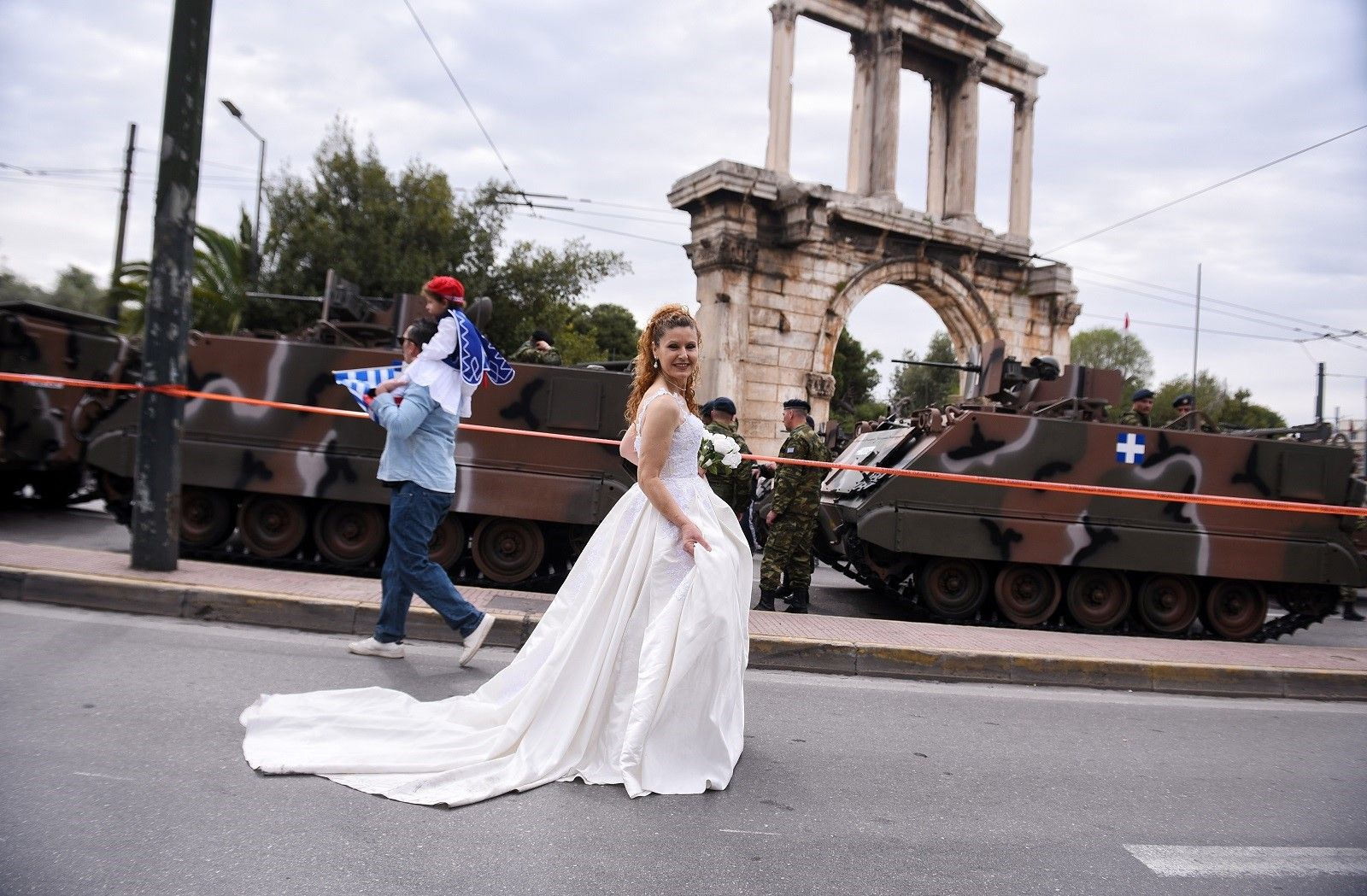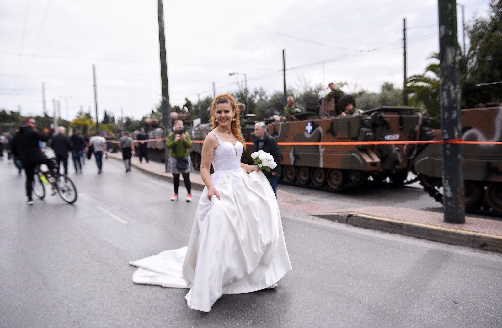 Μία νύφη έκανε την εμφάνισή της δίπλα στα άρματα μάχης λίγο πριν την έναρξη της στρατιωτικής παρέλασης στο Σύνταγμα για την εθνική επέτειο της 25ης Μαρτίου 1821.
