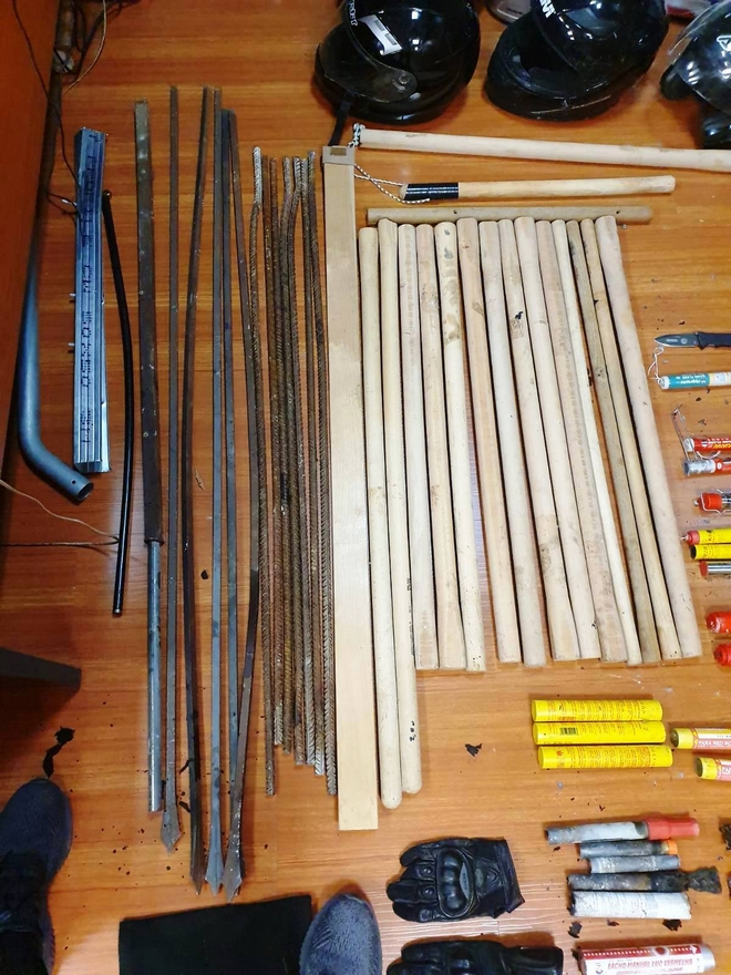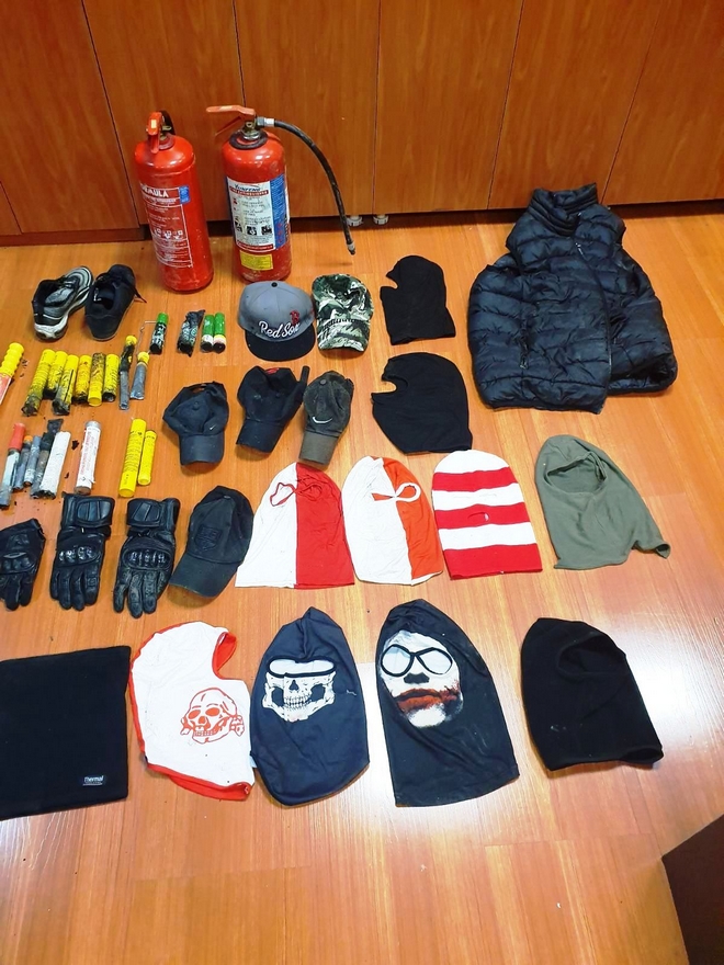 Κατά τη διάρκεια της συμπλοκής πραγματοποιήθηκαν εκατέρωθεν ρίψεις φωτοβολίδων χειρός και ευθείας βολής, αυτοσχέδιων εμπρηστικών μηχανισμών, πέτρες και χρησιμοποιήθηκαν στειλιάρια, σίδερα, μαχαίρια καθώς και άλλα αντικείμενα.