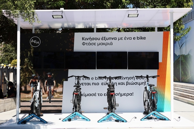 Παράλληλα, ηλεκτρικά ποδήλατα περιμένουν τους επισκέπτες έξω από το περίπτερο της ΔΕΗ, προκειμένου να τους δώσουν την ευκαιρία να δοκιμάσουν την εμπειρία της μετακίνησης με ποδήλατα ηλεκτρικής υποβοήθησης.