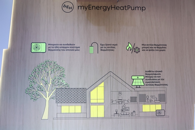 Σε έναν μεγάλο ειδικά σχεδιασμένο και διαμορφωμένο διαδραστικό τοίχο του περιπτέρου της ΔΕΗ απεικονίζεται το σχεδιάγραμμα ενός σπιτιού και γύρω του εικονίδια και ερωτήσεις για τις αντλίες θερμότητας. Ο φωτιζόμενος τοίχος με την touch screen οθόνη δίνει την ευκαιρία στους επισκέπτες να μάθουν τα πάντα για το ΔΕΗ my Energy Ηeat Pump, τον πιο σύγχρονο και αποδοτικό τρόπο ψύξης και θέρμανσης.