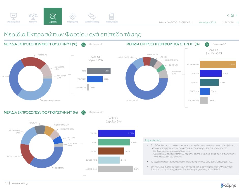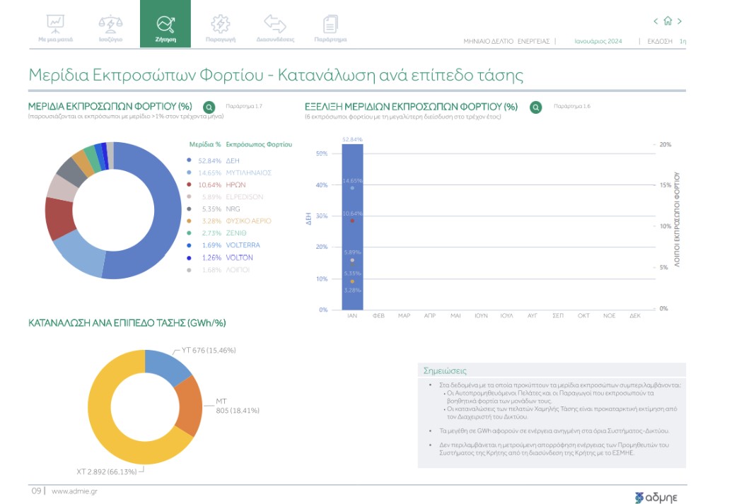 Σε γενικό επίπεδο το μερίδιο της ΔΕΗ υποχώρησε από μήνα σε μήνα κατά σχεδόν 3 ποσοστιαίες μονάδες από 55,62% τον Δεκέμβριο του 2023 σε 52,84% τον Ιανουάριο του 2024.
