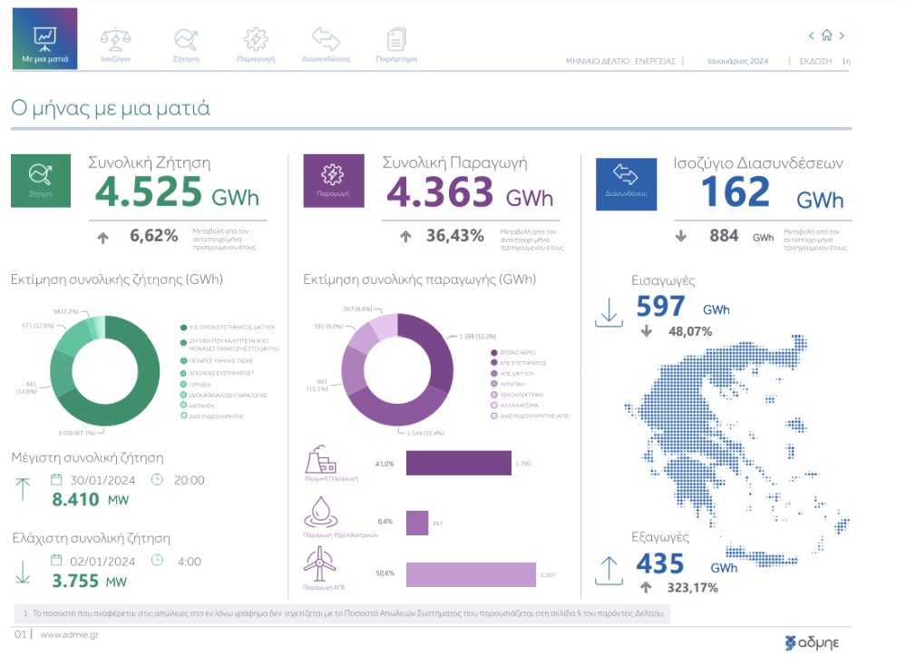 Η συνολική ζήτηση αυξήθηκε κατά 6,62% σε σχέση με τον Ιανουάριο του 2023, ενώ αντίστοιχα ανοδικά κινήθηκε και η συνολική παραγωγή με αύξηση 36,43% σε σχέση με ένα χρόνο πριν. Ιδιαίτερη αξία έχει ότι το κυρίαρχο καύσιμο στο μίγμα ηλεκτροπαραγωγής του μήνα υπήρξε η «πράσινη» ενέργεια με το μερίδιο των ΑΠΕ να φτάνει στο 50,6% έναντι 41,0% η θερμική παραγωγή και 8,4% τα υδροηλεκτρικά.