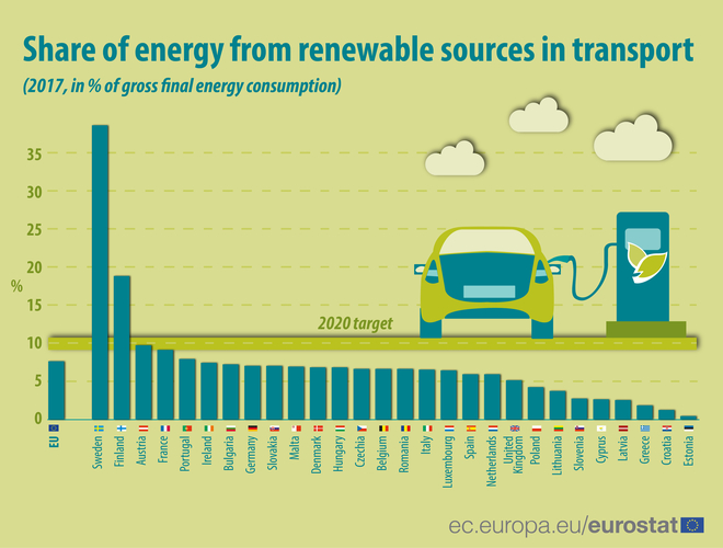 Τρίτη από το τέλος είναι η Ελλάδα στην χρήση καυσίμων από ανανεώσιμες πηγές ενέργειας στις μεταφορές σύμφωνα με τα στοιχεία της Eurostat. Συγκεκριμένα το ποσοστό στην Ελλάδα είναι μόλις στο 1,8% με τις μόνες χώρες που βρίσκονται πίσω να είναι η Κροατία (1,2%) και η Εσθονία (0,4%).