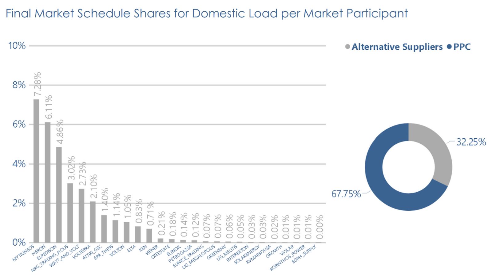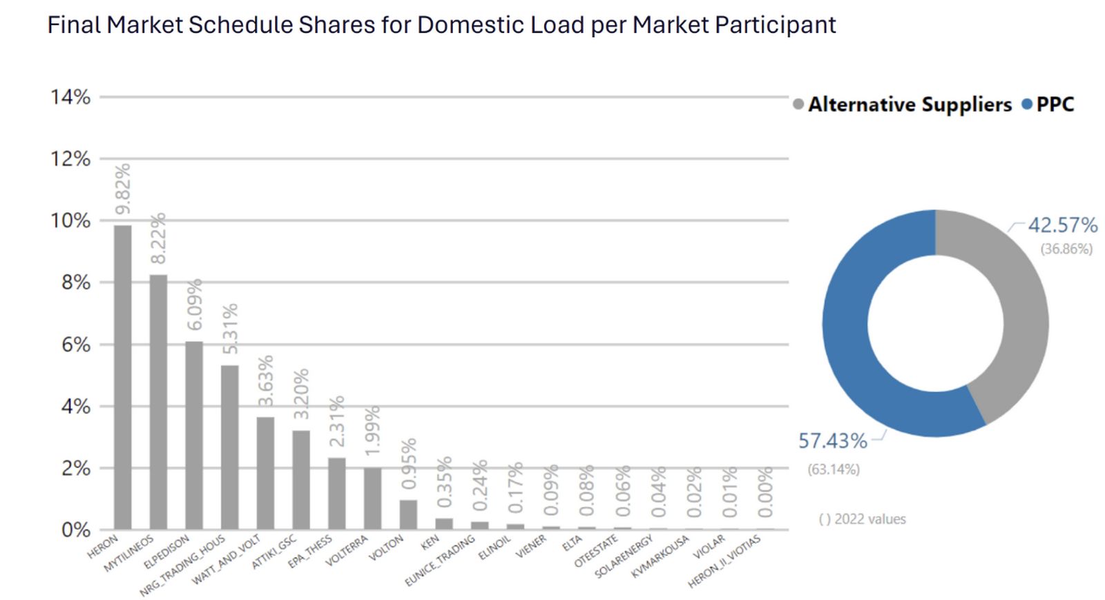 Στο «κλείσιμο» του 2023, το μερίδιο της ΔΕΗ υποχώρησε στο 57.43% από 63.14% και αντίστοιχα των εναλλακτικών παρόχων αυξήθηκε στο 42.57% από 36.86%. Να σημειωθεί ότι ανάλογη εικόνα παρουσιάζεται κάθε χρόνο από το 2020 μέχρι σήμερα, δηλαδή από όταν ξεκίνησε το target model μέχρι σήμερα, δεδομένου ότι υπάρχει σχετική υποχρέωση για την απομείωση του μεριδίου της ΔΕΗ στα επίπεδα του 50%.