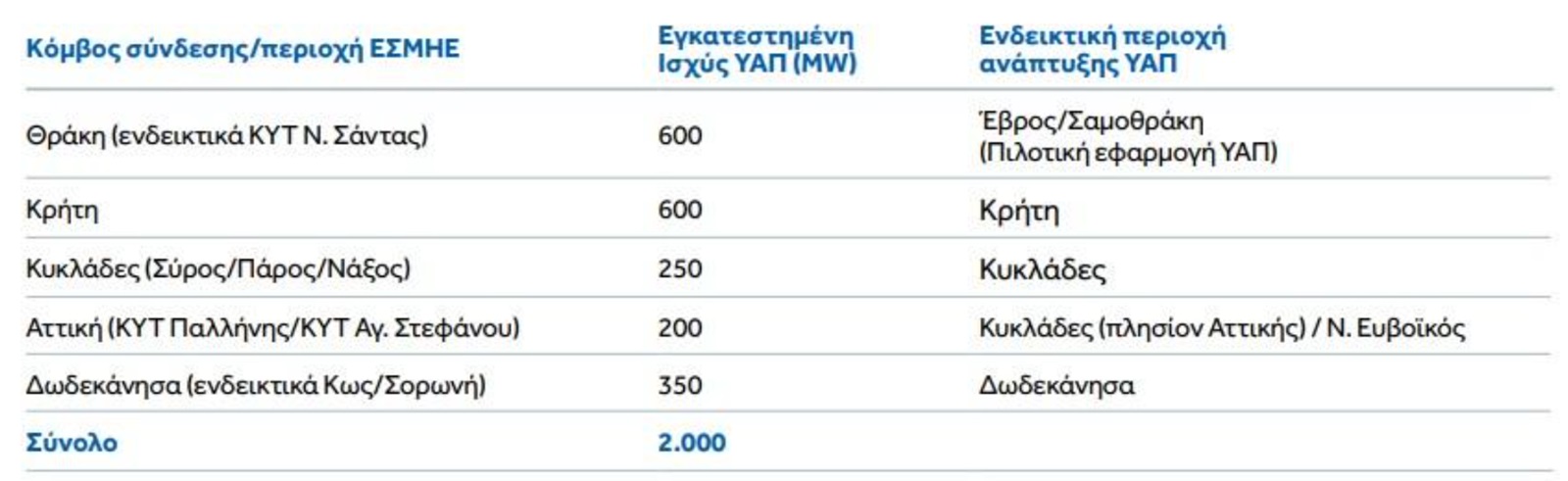 Υπενθυμίζεται ότι τον Ιανουάριο του 2024 η Επιτροπή υπέβαλε πρόταση για τη δέσμευση ηλεκτρικού χώρου 2 GW, για υποδοχή έργων ΥΑΠ, ο οποίος σύμφωνα με το δεκαετές θα επιμεριστεί σε 5 περιοχές. Συγκεκριμένα, για πιλοτικά έργα 600 MW σε Έβρο και Σαμοθράκη, στην Κρήτη επίσης για 600 MW, στις Κυκλάδες, στα νησιά Σύρο, Πάρο και Νάξο για έργα 250 MW, σε νησιά των Κυκλάδων κοντά στην Αττική, καθώς και στον Νότιο Ευβοϊκό για 200 MW και στα Δωδεκάνησα, με έργα 300 MW.