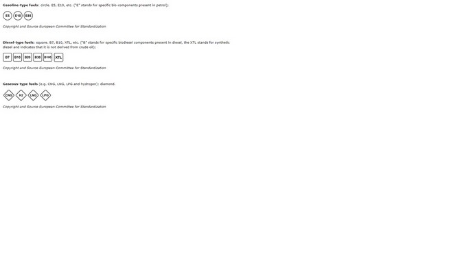 -Για τη βενζίνη ένας κύκλος με το γράμμα Ε (από τη λέξη ethanol, αιθανόλη) ένας αριθμός που υποδεικνύει το μέγιστο ποσοστό περιεκτικότητας σε αιθανόλη. Για παράδειγμα το αυτοκόλλητο Ε10 σε μια αντλία θα σημαίνει ότι παρέχει βενζίνη με περιεκτικότητα έως 10% σε αιθανόλη. Στο ρεζερβουάρ αντίστοιχα η ίδια επισήμανση θα σημαίνει ότι το όχημα μπορεί να χρησιμοποιήσει βενζίνη με μέγιστη περιεκτικότητα αιθανόλης 10%.