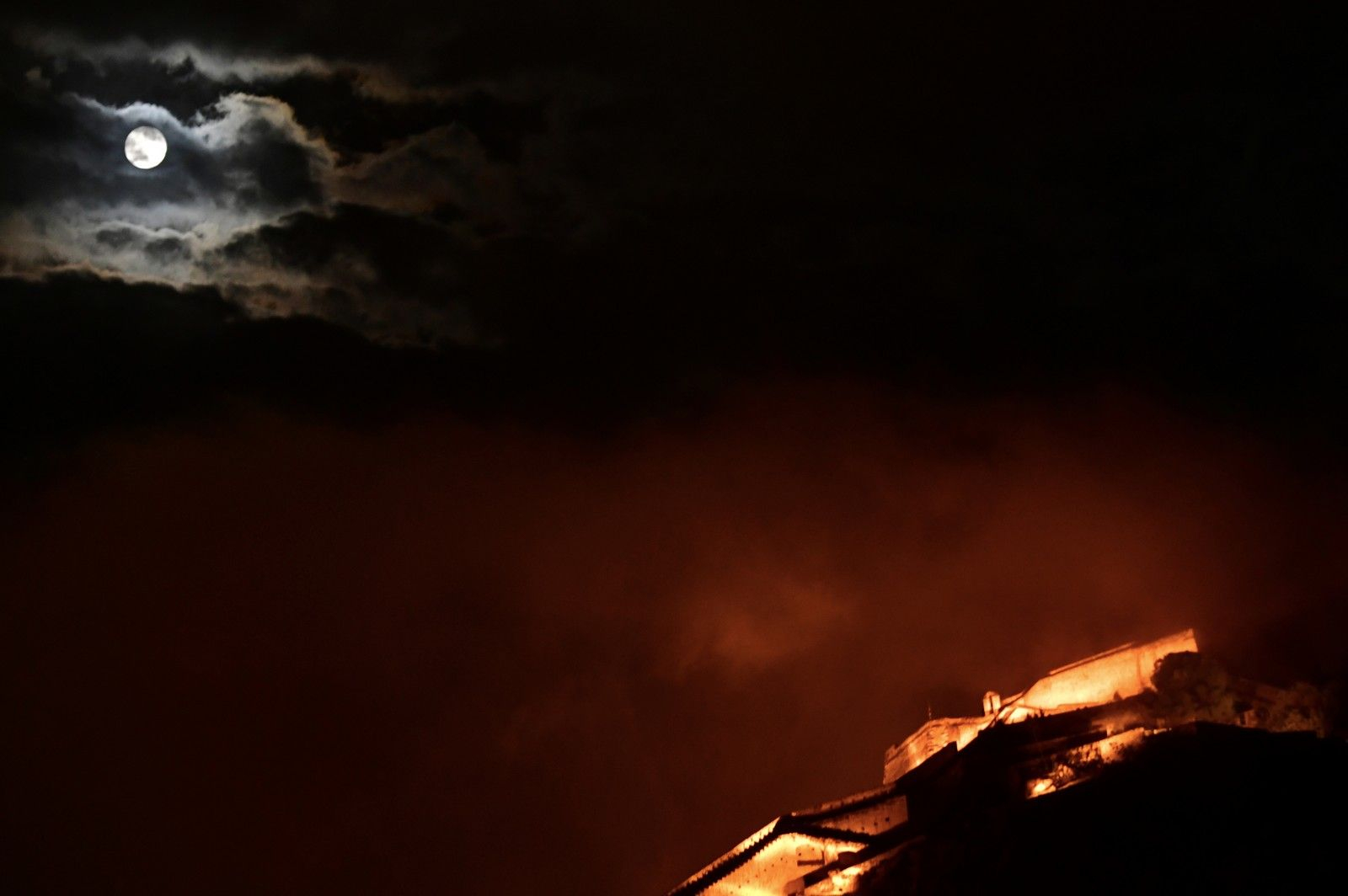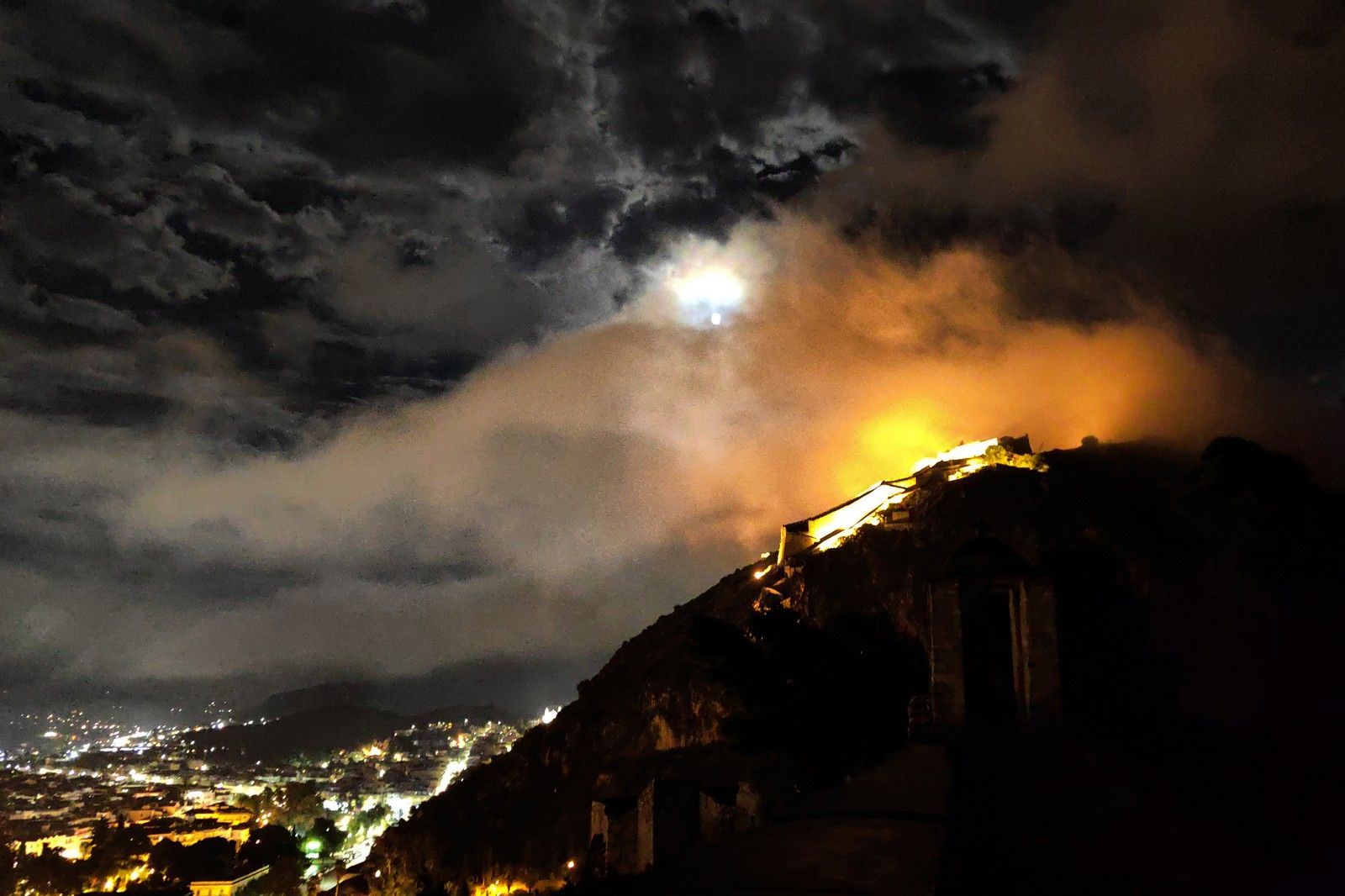 Ôï öåããÜñé áíáôÝëëåé ìÝóá áðü ôá óýííåöá ðÜíù áðü ôï êÜóôñï ÐáëáìÞäé óôï Íáýðëéï, ÄåõôÝñá 6 Ïêôùâñßïõ 2025. Ðñüêåéôáé ãéá ôç ëåãüìåíç «ÐáíóÝëçíï ôçò ÓõãêïìéäÞò», êáèþò åßíáé ç ðáíóÝëçíïò ðïõ óõìâáßíåé ðéï êïíôÜ óôç öèéíïðùñéíÞ éóçìåñßá. Ç ðáíóÝëçíïò ôïõ Ïêôùâñßïõ åßíáé åðßóçò õðåñðáíóÝëçíïò, ðñÜãìá ðïõ óçìáßíåé üôé ç ÓåëÞíç âñßóêåôáé êïíôÜ óôï êïíôéíüôåñï óçìåßï ôçò ôñï÷éÜò ôçò ãýñù áðü ôç Ãç (ðåñßãåéï), åìöáíéæüìåíç ìåãáëýôåñç êáé öùôåéíüôåñç áðü ôï óõíçèéóìÝíï. Ç ïíïìáóßá «ÖåããÜñé ôçò ÓõãêïìéäÞò» (Harvest Moon) ðñïÝñ÷åôáé áðü ôçí áãñïôéêÞ ðáñÜäïóç. ΜΠΟΥΓΙΩΤΗΣ ΒΑΓΓΕΛΗΣ/ΙΝΤΙΜΕ