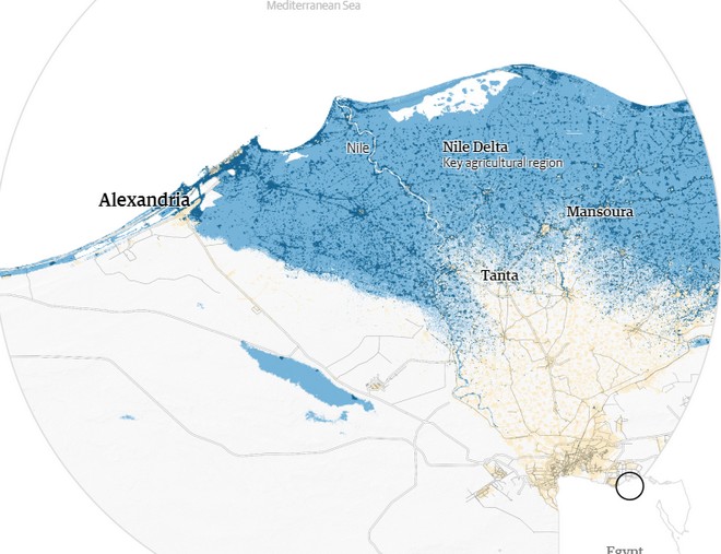 Σύμφωνα με τους ειδικούς, οι παραλίες της Αλεξάνδρειας θα βυθιστούν ακόμη και με αύξηση της στάθμης της θάλασσας κατά 0,5 μέτρα και 8 εκατ. άνθρωποι θα εκτοπιστούν από τις πλημμύρες αν δεν ληφθούν προστατευτικά μέτρα.