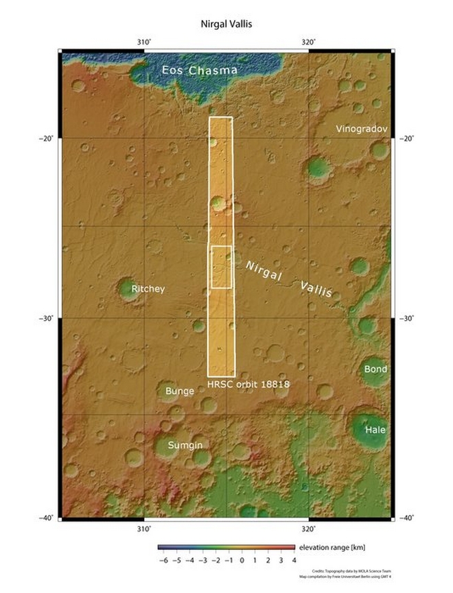 Χαρακτηριστική είναι η φωτογράφηση της περιοχής Nirgal Vallis, ενός αρχαίου συστήματος κοιλάδων που κάποτε ήταν γεμάτη τρεχούμενα νερά ποταμών. Στη δυτική πλευρά της περιοχής οι εικόνες δείχνουν πολλαπλά φαράγγια βάθους περίπου 200 μέτρων και πλάτους δύο χιλιομέτρων, με βυθό καλυμμένο σήμερα από αμμόλοφους.