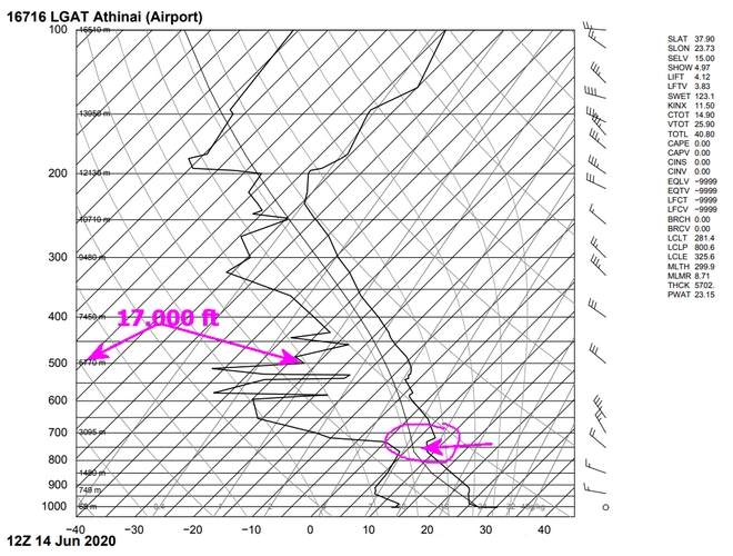 Από εκεί και μετά, αν θέλεις να δώσεις επί πλέον πληροφορίες και να εξηγήσεις το γιατί συμβαίνει αυτό, μπορείς να παρουσιάσεις την ανάλυση του τεφιγράμματος (ειδικό μετεωρολογικό βοήθημα που αποτυπώνει την κατάσταση της ανώτερης ατμόσφαιρας με μετρήσεις από ραδιοβολίδες). Εκεί διακρίνεται το κάτω υγρό στρώμα (στα 700 hPa-3005 m) όπου σχηματίζονται τα νέφη Αc, As καθώς και το ανώτερο στρώμα με τα νέφη Ci ,Cs. Στη Στάθμη των 500 hPa διακρίνεται μάλιστα και το υψόμετρο της συγκεκριμένης πτήσης, ενώ από τον χάρτη αυτής της στάθμης ένας μετεωρολόγος καταλαβαίνει οτι πάνω απο την χώρα μας υπάρχει ευσταθής αντικυκλωνική ροή.