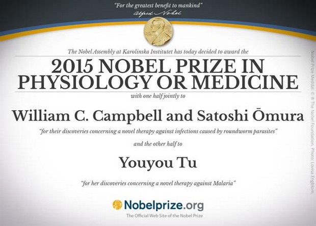 Οι βιοχημικοί Ουίλιαμ Κάμπελ, 85 ετών, και Σατόσι Ομούρα, 80 ετών, βραβεύονται από κοινού για τις “εργασίες τους σε μια νέα θεραπεία κατά των λοιμώξεων που προκαλούνται από παράσιτα”, ενώ η Γιούγιου Του βραβεύεται για τις “ανακαλύψεις της που αφορούν μια νέα θεραπεία κατά της ελονοσίας”.