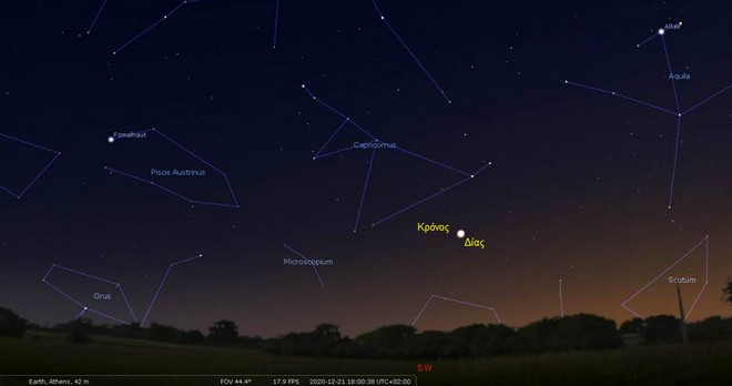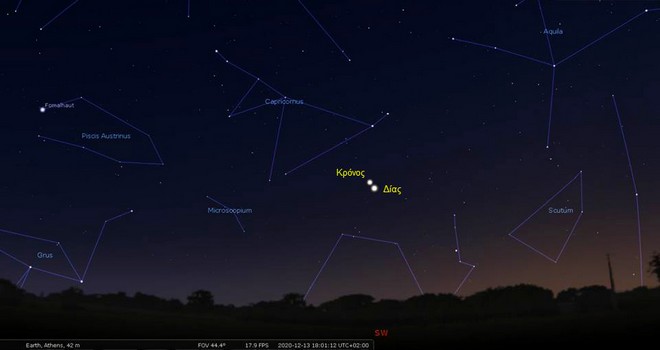 Αν κοιτάξετε απόψε κιόλας προς το νοτιοδυτικό ορίζοντα, μετά την δύση του Ηλίου, θα παρατηρήσετε τους πλανήτες Δία και Κρόνο να βρίσκονται σε σχετικά κοντινή απόσταση μεταξύ τους, καθώς προβάλλονται στην ουράνια σφαίρα. Ο λαμπερότερος είναι ο Δίας και ο λιγότερο λαμπερός ο Κρόνος. Από τον Σεπτέμβρη τους παρατηρούμε να πλησιάζουν μεταξύ του και ήδη φαίνονται σε απόσταση μικρότερη των 2 μοιρών. Κάθε βραδιά θα τους παρατηρούμε να πλησιάζουν όλο και περισσότερο, μέχρι τις 21 Δεκεμβρίου όπου θα έχουν επιτύχει την μέγιστη προσέγγιση τους, στις 0,1 μοίρες. Στις εικόνες (4) και (5) μπορείτε να συγκρίνετε τις θέσεις των πλανητών στον ουρανό στις 13/12 καθώς θα πλησιάζουν και στις 21/12 που θα έχουν πλησιάσει στο μέγιστο.