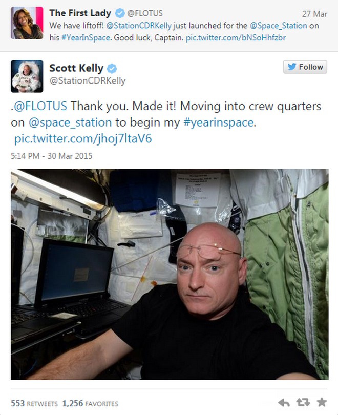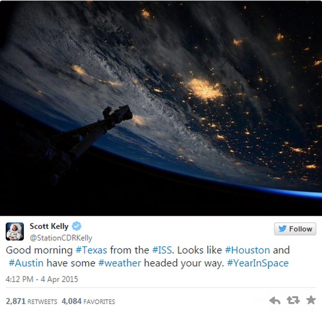 Ο Αμερικανός αστροναύτης Scott Kelly αποφάσισε να περάσει έναν ολόκληρο χρόνο στον διεθνή διαστημικό σταθμό προκειμένου να καταγράψει τις επιδράσεις που μπορεί να έχουν στην υγεία του οι συγκεκριμένες συνθήκες ζωής. Έτσι ο Kelly μετακόμισε περίπου 200 χιλιόμετρα “πάνω” από το σπίτι του και έχει την καλύτερη θέα στον κόσμο.