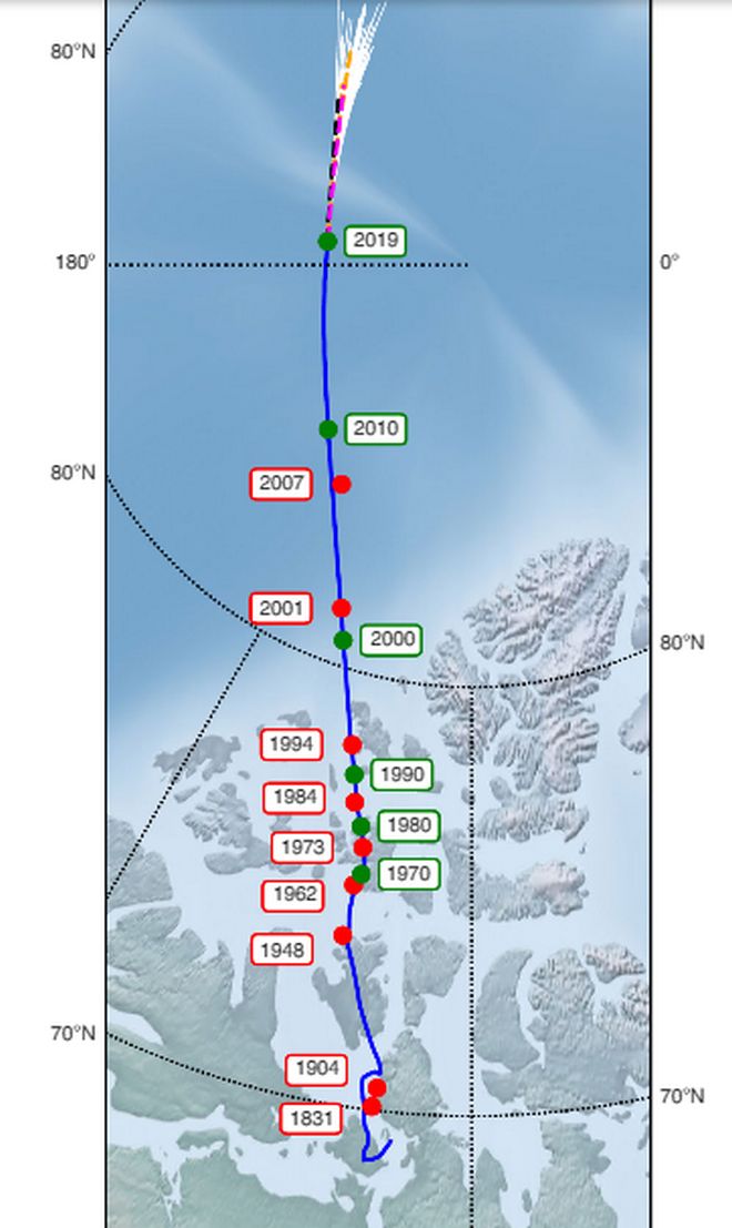 Οι δύο πόλοι είναι γνωστό εδώ και δεκαετίες ότι είναι σε μόνιμη κατάσταση μετατόπισης. Από τότε που τεκμηριώθηκε για πρώτη φορά από τους επιστήμονες, τη δεκαετία του 1830, ο βόρειος μαγνητικός πόλος περιπλανήθηκε περίπου 2.250 χιλιόμετρα στα πάνω τμήματα του Βόρειου Ημισφαιρίου από τον Καναδά προς τη Σιβηρία. Μεταξύ 1990 και 2005, ο ρυθμός αυτής της κίνησης επιταχύνθηκε από λιγότερο από 15 χιλιόμετρα ετησίως σε περίπου 50 έως 60 χιλιόμετρα το χρόνο.