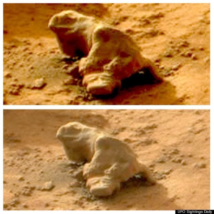 Παρακάτω βλέπουμε κάτι σαν απολιθωμένο ιγκουάνα, που έδωσε νέα τροφή σε όσους πιστεύουν ότι στον Αρη υπάρχει ζωή. Η φωτογραφία τραβήχτηκε τον Ιανουάριο του 2013. Το “πλάσμα” που απεικονίζει μοιάζει πολύ με ιγκουάνα, καθώς έχει προγούλι, ουρά και μάτι. Ωστόσο, η επιστημονική προσέγγιση λέει ότι το πιθανότερο είναι πως δεν πρόκειται ούτε για ιγκουάνα, ούτε για βάτραχο, αλλά απλώς για βράχο.