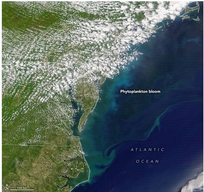 Το φυτοπλαγκτόν όπως γνωρίζουμε είναι για τον ωκεανό ό,τι τα χόρτα και η κάλυψη του εδάφους για την ξηρά. Τα διάτομα, τα κοκκολιθοφόρα, τα φύκια και άλλες μορφές φυτοπλαγκτού είναι πλωτοί, φυτικοί οργανισμοί που απορροφούν τον ήλιο, απορροφούν θρεπτικά συστατικά και δημιουργούν τη δική τους τροφή (ενέργεια). Στις 17 Μαΐου 2022, η σουίτα Visible Infrared Imaging Radiometer Suite (VIIRS) του δορυφόρου NOAA-20 απέκτησε μια εικόνα φυσικού χρώματος μιας ανοιξιάτικης άνθισης φυτοπλαγκτού στις ακτές του Νιου Τζέρσεϊ, του Ντέλαγουερ, του Μέριλαντ, της Βιρτζίνια και της Βόρειας Καρολίνα.