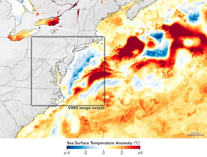 Ο παραπάνω χάρτης δείχνει ανωμαλίες θερμοκρασίας στην επιφάνεια της θάλασσας για τις 19 Μαΐου 2022, σε όλο τον βορειοδυτικό Ατλαντικό Ωκεανό. Απεικονίζει πόσο το επιφανειακό στρώμα ήταν πάνω ή κάτω από τη μακροπρόθεσμη μέση θερμοκρασία για αυτήν την εποχή του χρόνου. Τα δεδομένα προέρχονται από το έργο Multiscale Ultrahigh Resolution Sea Surface Surface Temperature (MUR SST), που βασίζεται στο Jet Propulsion Laboratory της NASA. Το MUR SST συνδυάζει μετρήσεις της θερμοκρασίας της επιφάνειας της θάλασσας από πολλούς δορυφόρους της NASA, NOAA και διεθνείς δορυφόρους, καθώς και παρατηρήσεις πλοίων και σημαδούρων. Παρατηρείστε το κομμάτι του πιο δροσερού νερού κοντά στην ακτή – ένα σημάδι ότι η ανύψωση και αρκετές πρόσφατες έντονες βροχοπτώσεις έχουν δροσίσει τα επιφανειακά ύδατα.