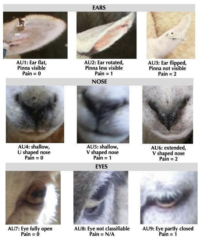 Όταν ένα πρόβατο πονάει, οι βασικές ενδείξεις της ενόχλησης στο πρόσωπό του είναι πέντε: τα μάτια του στενεύουν, τα μάγουλα του τεντώνονται, τα αυτιά του διπλώνουν προς τα εμπρός, τα χείλη του τραβιούνται προς τα κάτω και προς τα πίσω, ενώ τα ρουθούνια του αλλάζουν σχήμα από U σε V.