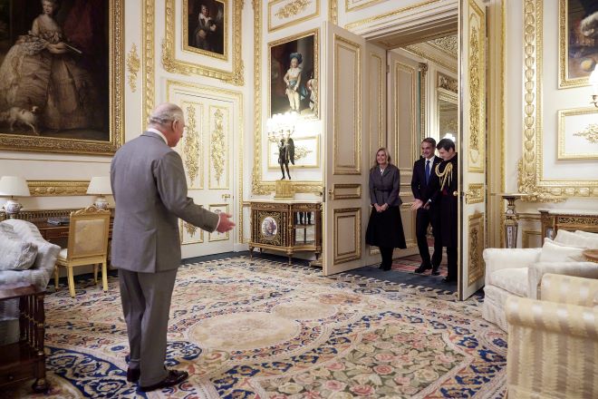 Ένα δίκιο πρέπει να του το δώσουμε του πρωθυπουργού. Να είσαι στο Λονδίνο, να ετοιμάζεσαι για επίσκεψη στο Κάστρο Windsor όπου θα συναντήσεις τον νέο Βασιλιά τoυ Ηνωμένου Βασιλείου Κάρολο τον 3ο, ο οποίος (όπως βλέπετε στην φωτογραφία υποδέχεται εγκάρδια το πρωθυπουργικό ζεύγος) και να σε απασχολεί τι θα ψηφίσει ο Τζαβάρας κι ο Βλάχος στην επιτροπή της Βουλής για τις υποκλοπές; Ε δεν πάει. Γι αυτό και το ανέθεσε στον Θανάση Μπούρα το πρόβλημα κι αυτός το έλυσε μια χαρά.