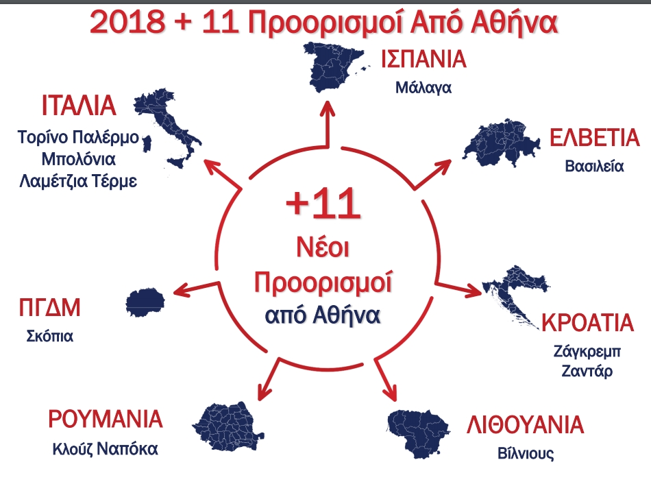 Το νέο πρόγραμμα της εταιρείας περιλαμβάνει ένα δίκτυο 153 προορισμών, σε 44 συνολικά χώρες, με 16,6 εκ. διαθέσιμες θέσεις, 700,000 περισσότερες από το 2017. Η ενίσχυση του δικτύου της εταιρείας προσφέρει το 2018 αυξημένη προσβασιμότητα, μέσω και των νέων συνδέσεων, σε βασικές αγορές που αποτελούν κύριες πηγές τουρισμού για τη χώρα μας, όπως είναι η Γαλλία, η Ιταλία και η Γερμανία.