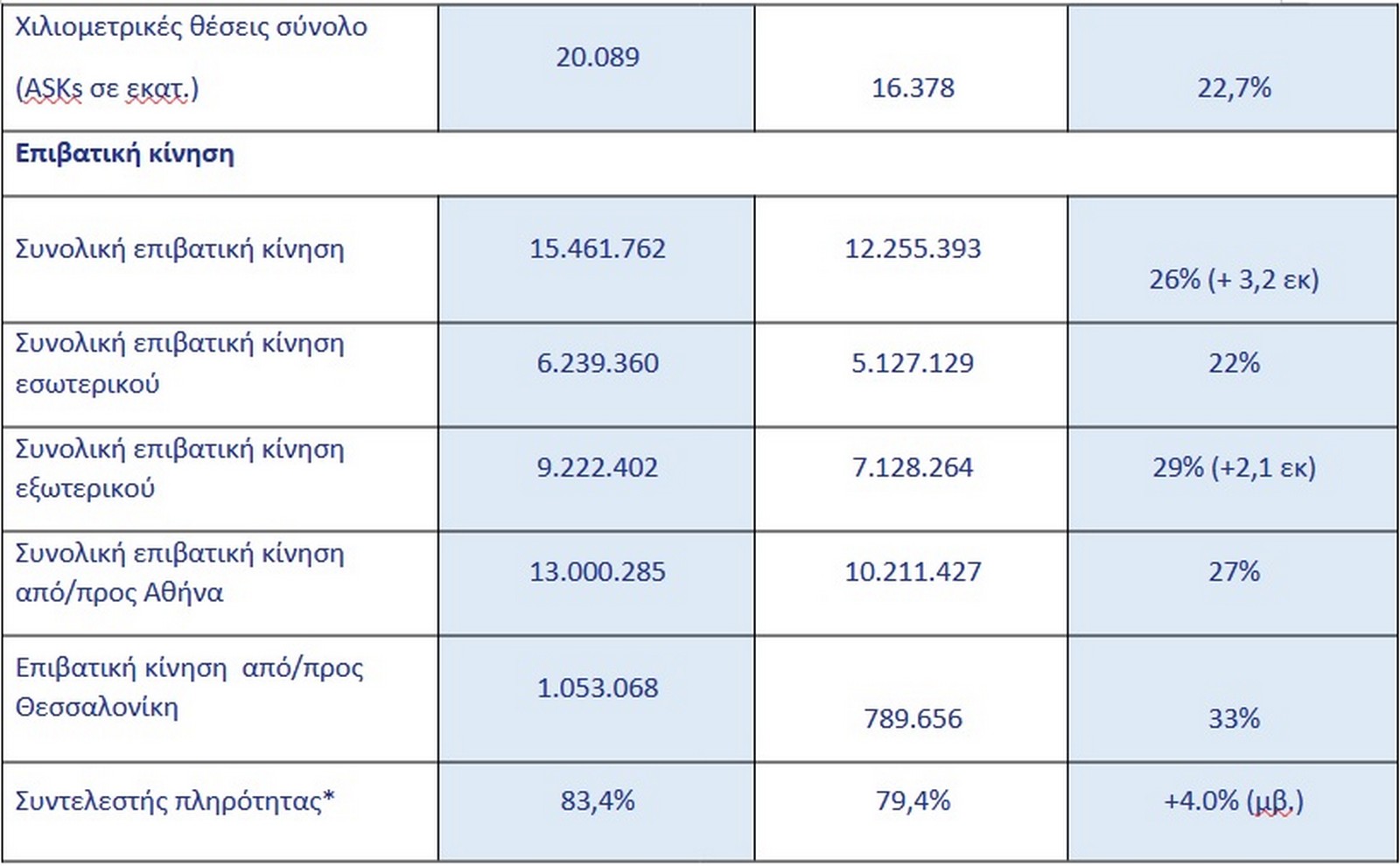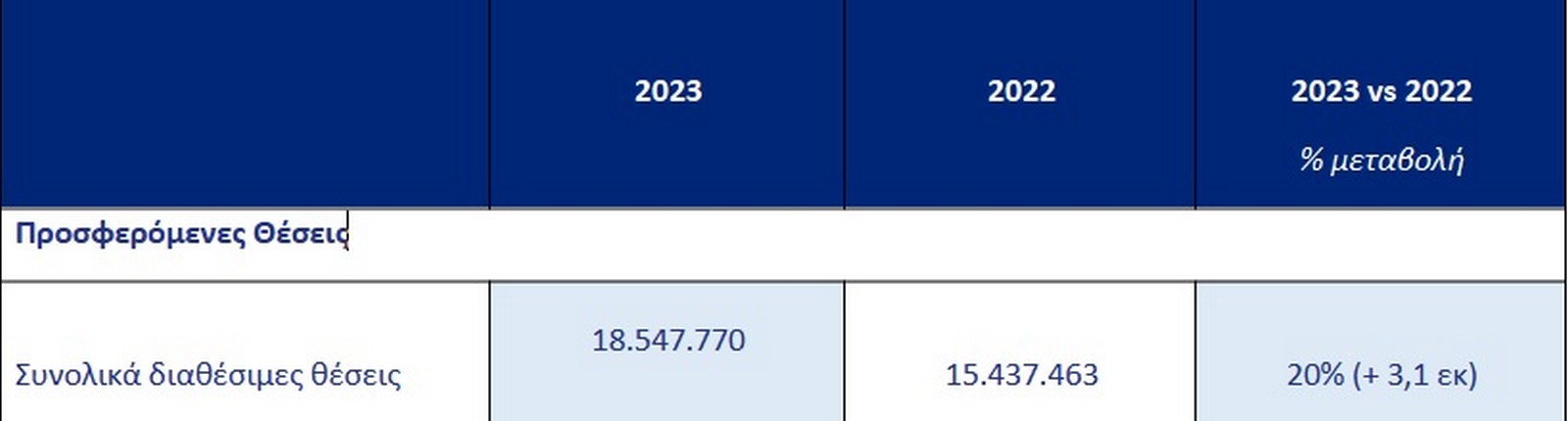 Νέοι προορισμοί, όπως το Ντουμπάι, το Ίνσμπρουκ και η Μπρατισλάβα, αλλά και η διατήρηση θερινών δρομολογίων (από την Αθήνα προς το Μπρίστολ, τη Μάλαγα, το Μπιλμπάο, το Ταλίν, τη Ρίγα, την Τυνησία, αλλά και προς τη Βαρκελώνη από τη Θεσσαλονίκη) κατά τη χειμερινή περίοδο, είχαν ως αποτέλεσμα την αύξηση των χιλιομετρικών θέσεων κατά 23%, ξεπερνώντας τα 20 δις χιλιομετρικές θέσεις σε σχέση με το 2022.