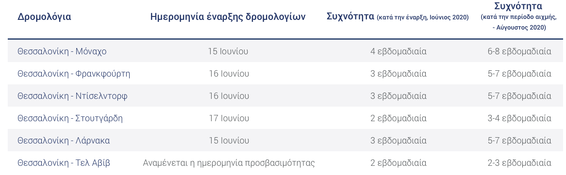 Οι συχνότητες θα είναι αρχικά περιορισμένες, αλλά θα αυξάνονται ανάλογα με την ανταπόκριση του κοινού και τη δυναμική των κρατήσεων και πάντα με την έγκριση των αρχών για την επαναδραστηριοποίηση προς διαφορετικές χώρες, ανάλογα με τα επιδημιολογικά χαρακτηριστικά. Άλλωστε, ο στόχος της εταιρείας είναι να εξυπηρετήσει όσο μπορεί περισσότερο και σε αυτήν την εξαιρετικά δύσκολη συγκυρία, τις ανάγκες της Βόρειας Ελλάδας.