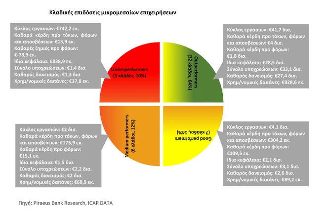 Ενδεικτικό της θετικής δυναμικής της ελληνικής μικρομεσαίας επιχειρηματικότητας είναι ότι η μέση βαθμίδα αξιολόγησης ανέρχεται πλέον σε “a” από “b” πέρυσι και “c” την τριετία 2010-2012. Με βάση τα τελευταία στοιχεία, στην κατηγορία υψηλών επιδόσεων κατατάσσονται 32 κλάδοι (το 64% του συνόλου), με συνολικό κύκλο εργασιών €41,7 δισεκ., καθαρή κερδοφορία προ φόρων 1,8 δισεκ. και ίδια κεφάλαια ύψους €28,5 δισεκ. Στην κατηγορία ικανοποιητικών επιδόσεων ανήκουν 7 κλάδοι (14% του συνόλου) με κύκλο εργασιών €4,1 δισεκ., καθαρά κέρδη προ φόρων €109,5 εκατ. και ίδια κεφάλαια €2,1 δισεκ. Στις μεσαίες επιδόσεις κατατάσσεται το 12% των κλάδων με πωλήσεις €2 δισεκ. και καθαρά κέρδη προ φόρων μόλις €15,1 εκατ. Τέλος, οι κλάδοι που υποαποδίδουν είναι 5 (το 10%) με πωλήσεις €742,2 εκατ. και καθαρές ζημιές €78,9 εκατ.