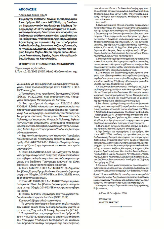 Ισως κάτι γνώριζε η Fraport, που έχει αναλάβει την ανακατασκευή και διαχείριση 14 περιφερειακών αεροδρομίων, αναφορικά με τις προθέσεις του υπουργού Υποδομών και Μεταφορών, Χρήστου Σπίρτζη, του οποίου απόφαση δημοσιεύτηκε στην Εφημερίδα της Κυβέρνησης στις 25 Οκτωβρίου 2018 και αναφέρει ότι «είναι αναγκαία για λόγους δημοσίου συμφέροντος, που συνδέονται με την τουριστική ανάπτυξη της χώρας και την αύξηση του Ακαθάριστου Εθνικού Προϊόντος, η διερεύνηση των δυνατοτήτων ανάπτυξης των 23 αεροδρομίων…».