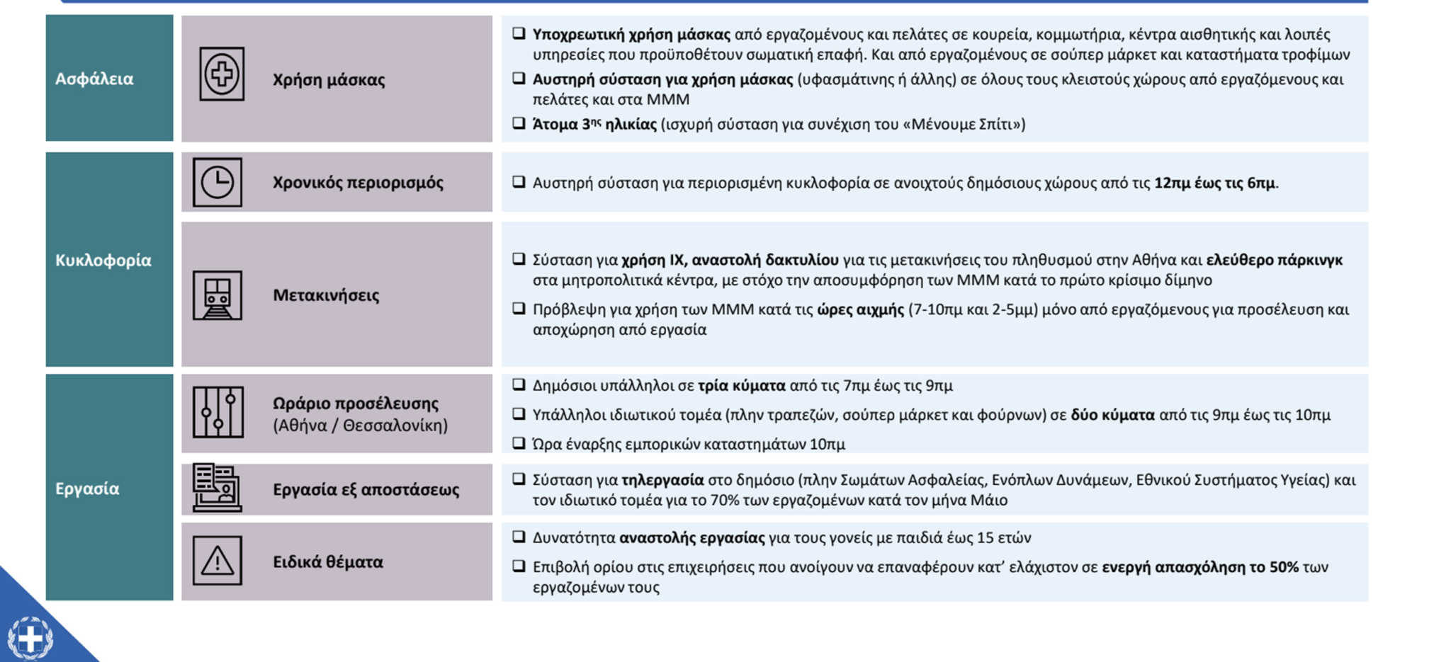 Όσον αφορά στη ρύθμιση του ωραρίου λειτουργίας των επιχειρήσεων η έναρξη τους μεταφέρεται στις 10.00 π.μ. με διευρυμένο ωράριο κατά περίπτωση, τήρηση αποστάσεων 2 μέτρων ανά άτομο, χρήση μάσκας για προσωπικό και πελάτες, ενώ συνιστάται μη χρήση ανελκυστήρων, αλλά εφόσον είναι αναγκαία τότε επιτρέπεται χρήση του 40% των προβλεπόμενων ατόμων ενώ αν το κατάστημα έχει κυλιόμενες δεν επιτρέπεται στους πελάτες η χρήση του ανελκυστήρα.